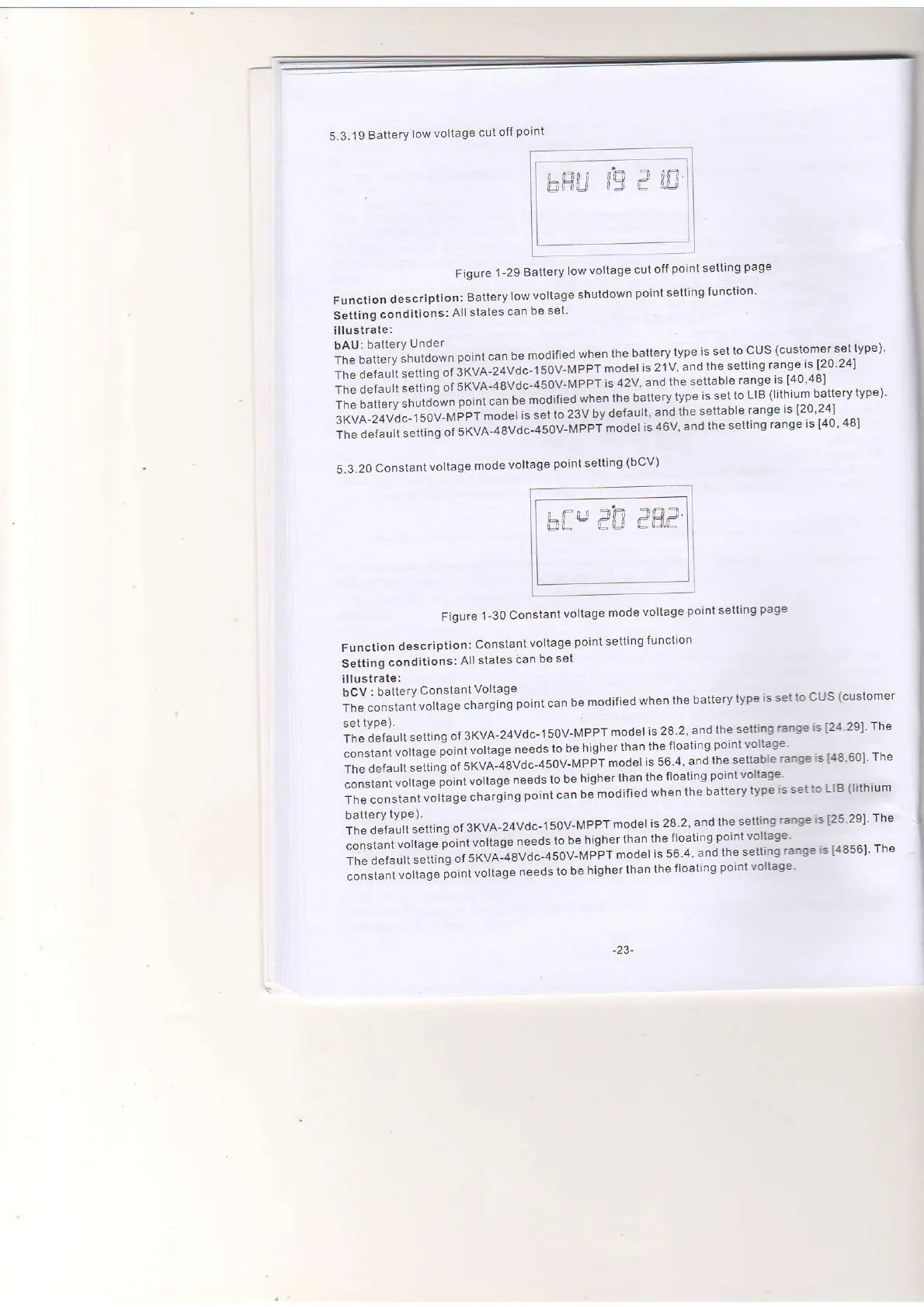 Techfine 1KVA - 5.3.19 Battery low voltage cut off point; 5.3.20 Constant voltage mode voltage point setting (bCV)