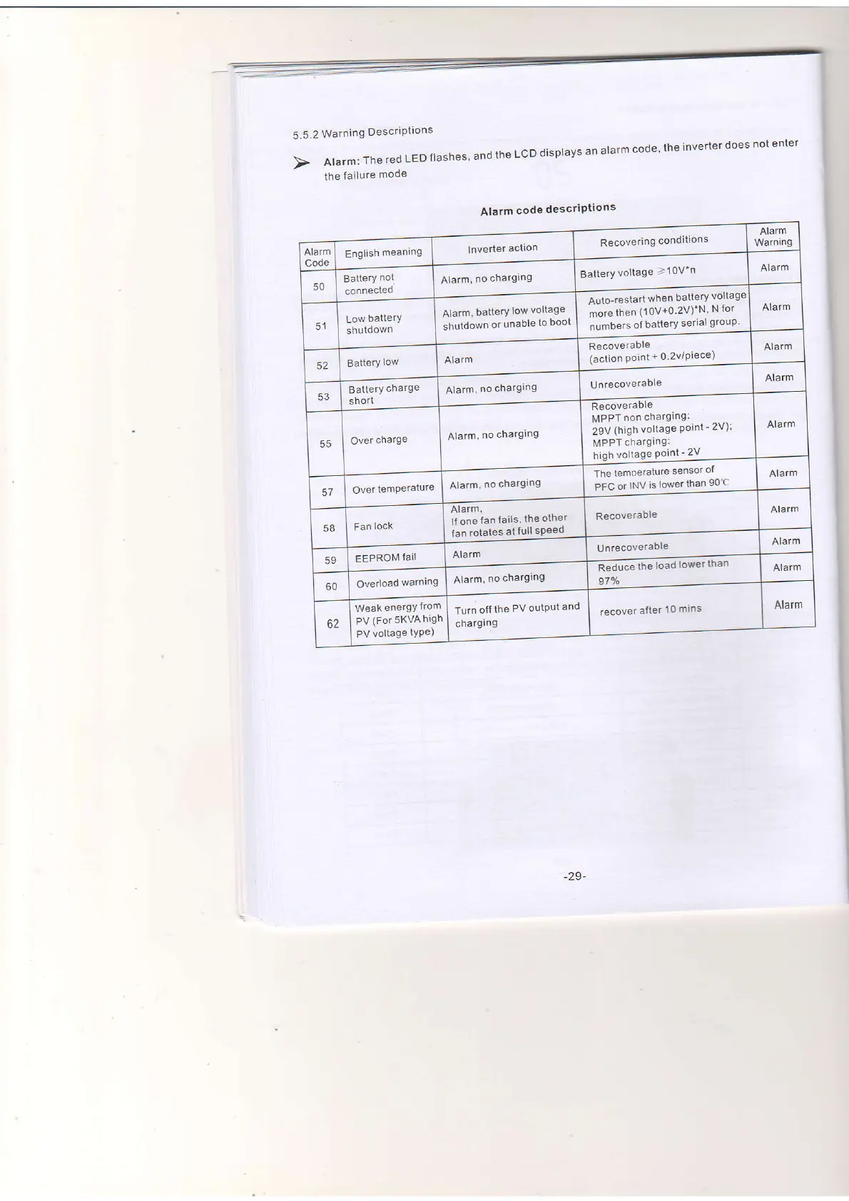 Techfine 1KVA - 5.5.2 Warning Descriptions