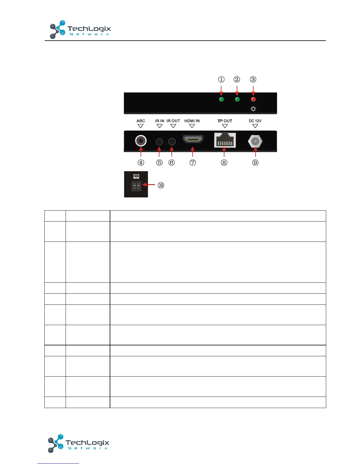 HDBT!Link!status!indicator,!lights!when!the !transmitter!&!receiver!are!linked!and!