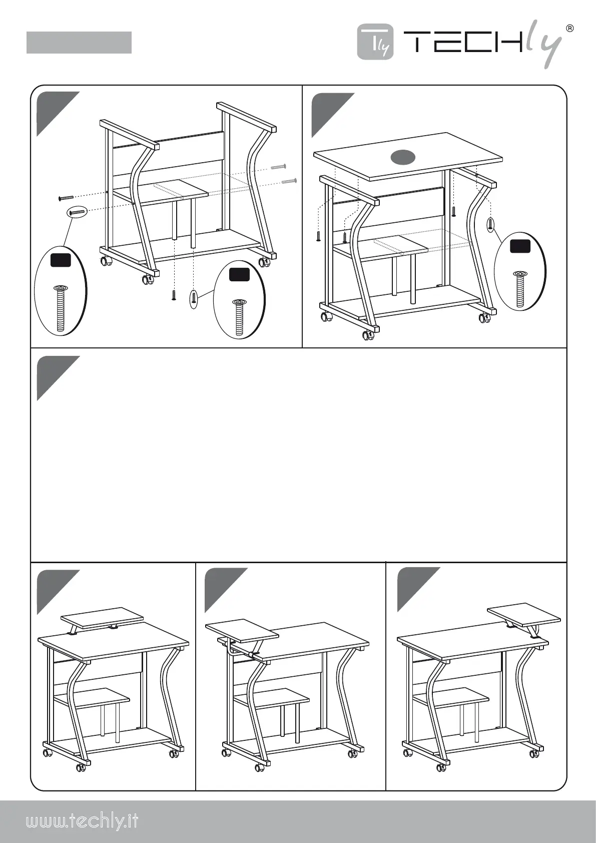 EN: The Printer/Monitor tray (4) can be installed in 3 positions (A,B,C) If you prefer A, please follow A1 and A2; if