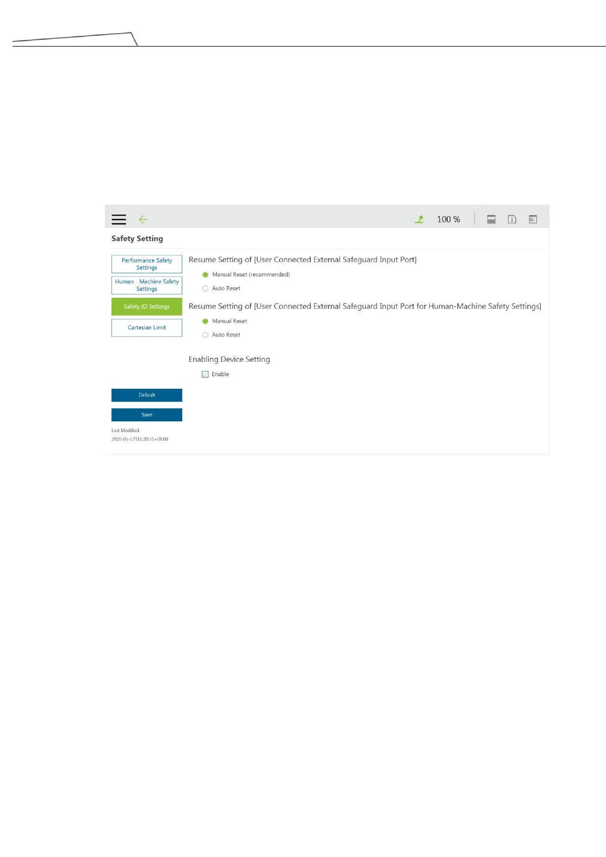 Safeguard-Human-Machine Safety Settings, it is recommended to set in Manual Reset as shown in the