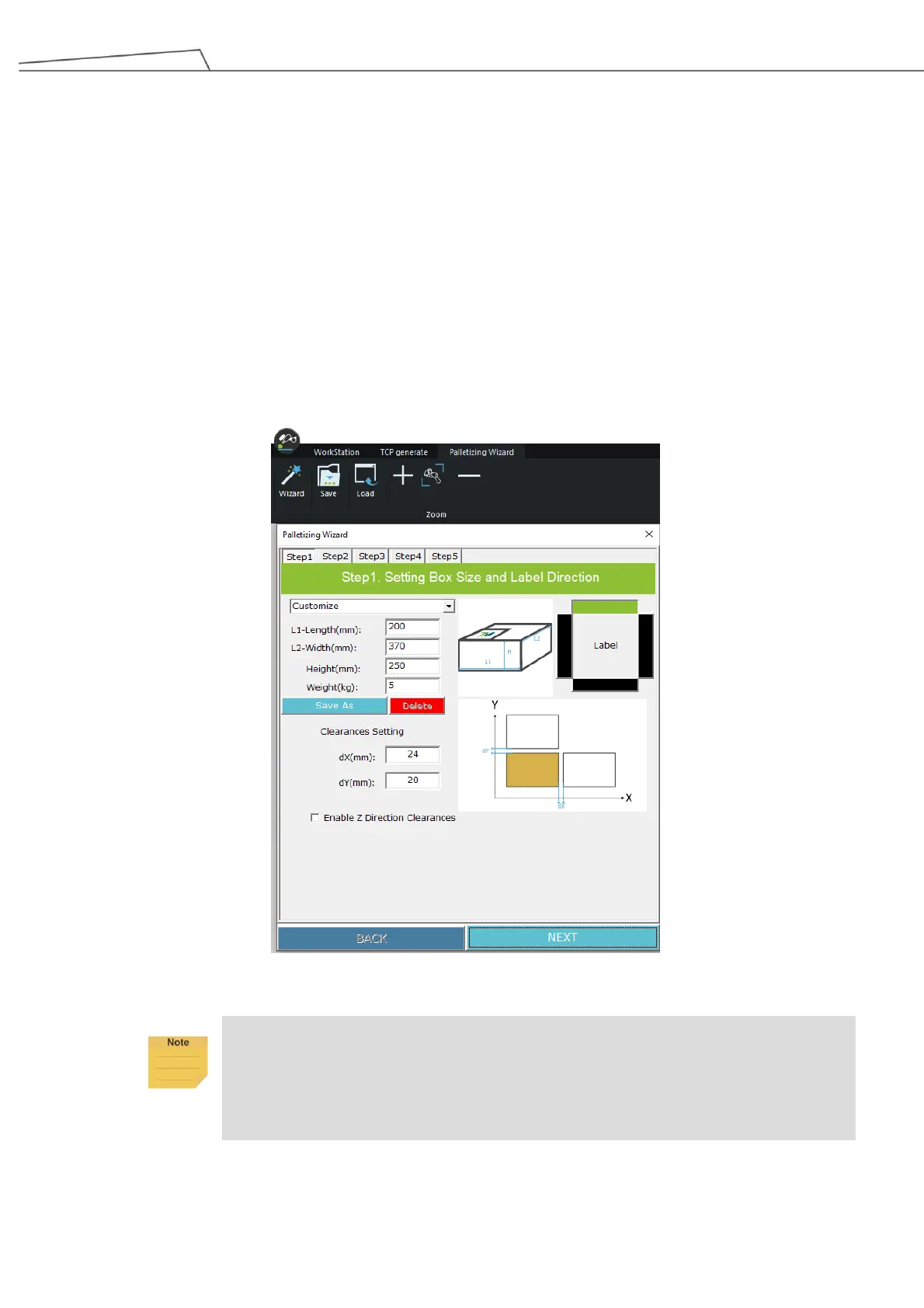 direction of the packaging label, and the clearances between the boxes in dX/dY/dZ directions.