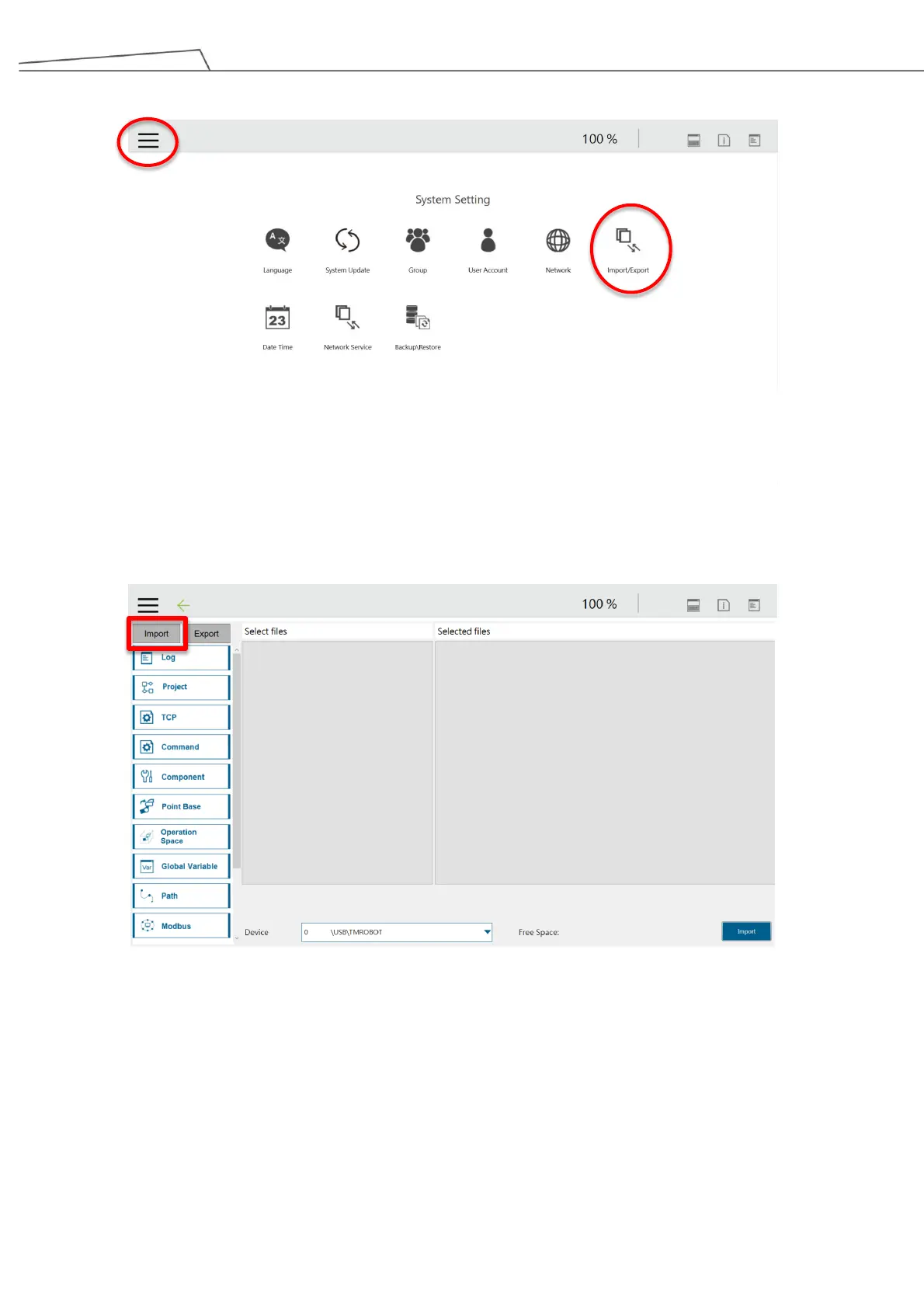 Techman Robot TM Palletizing Operator - Figure 109: Import;Export; Figure 110: Import File