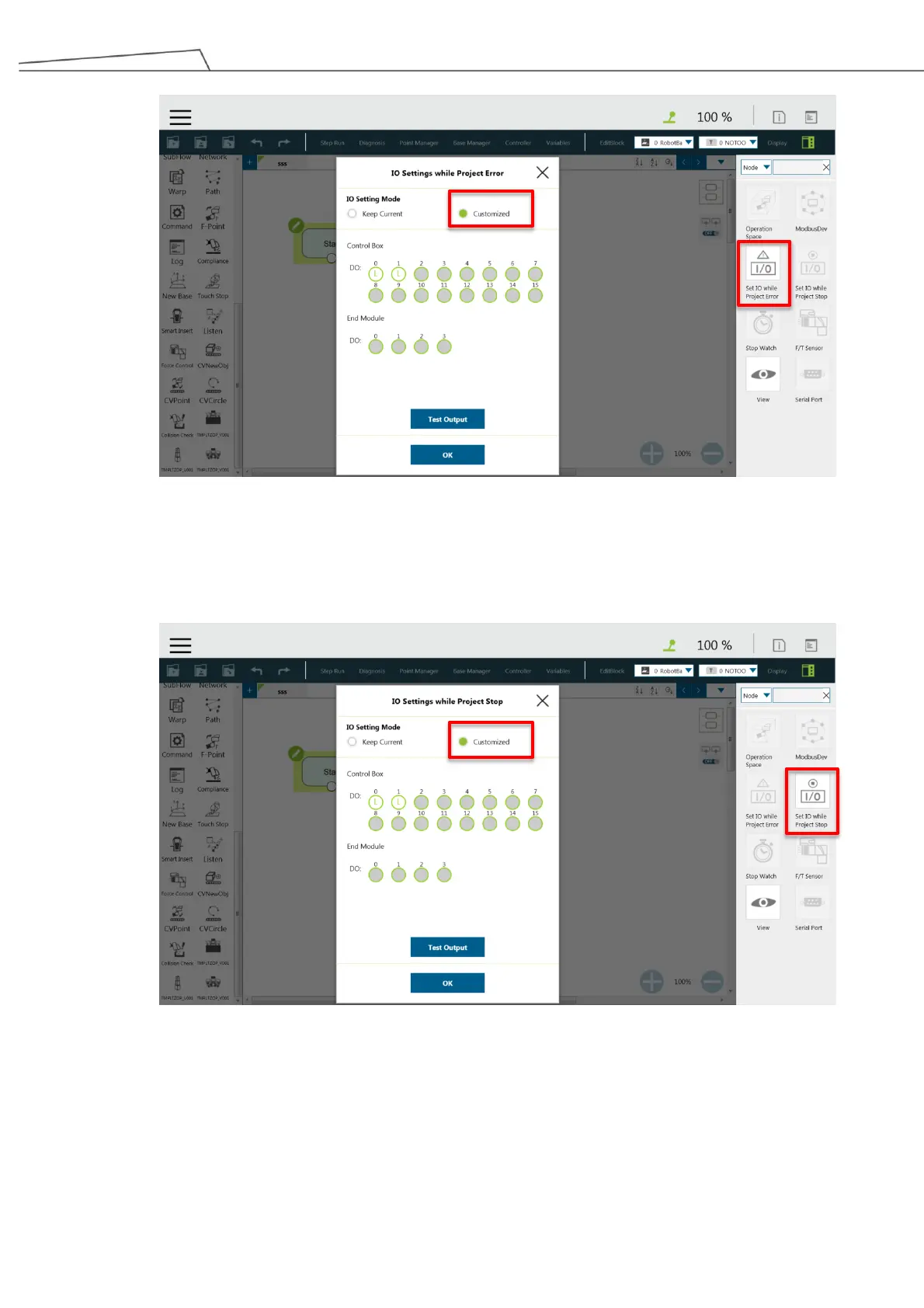 Techman Robot TM Palletizing Operator - Figure 117: Set I;O While Project Error; Figure 118: Set I;O While Project Stop