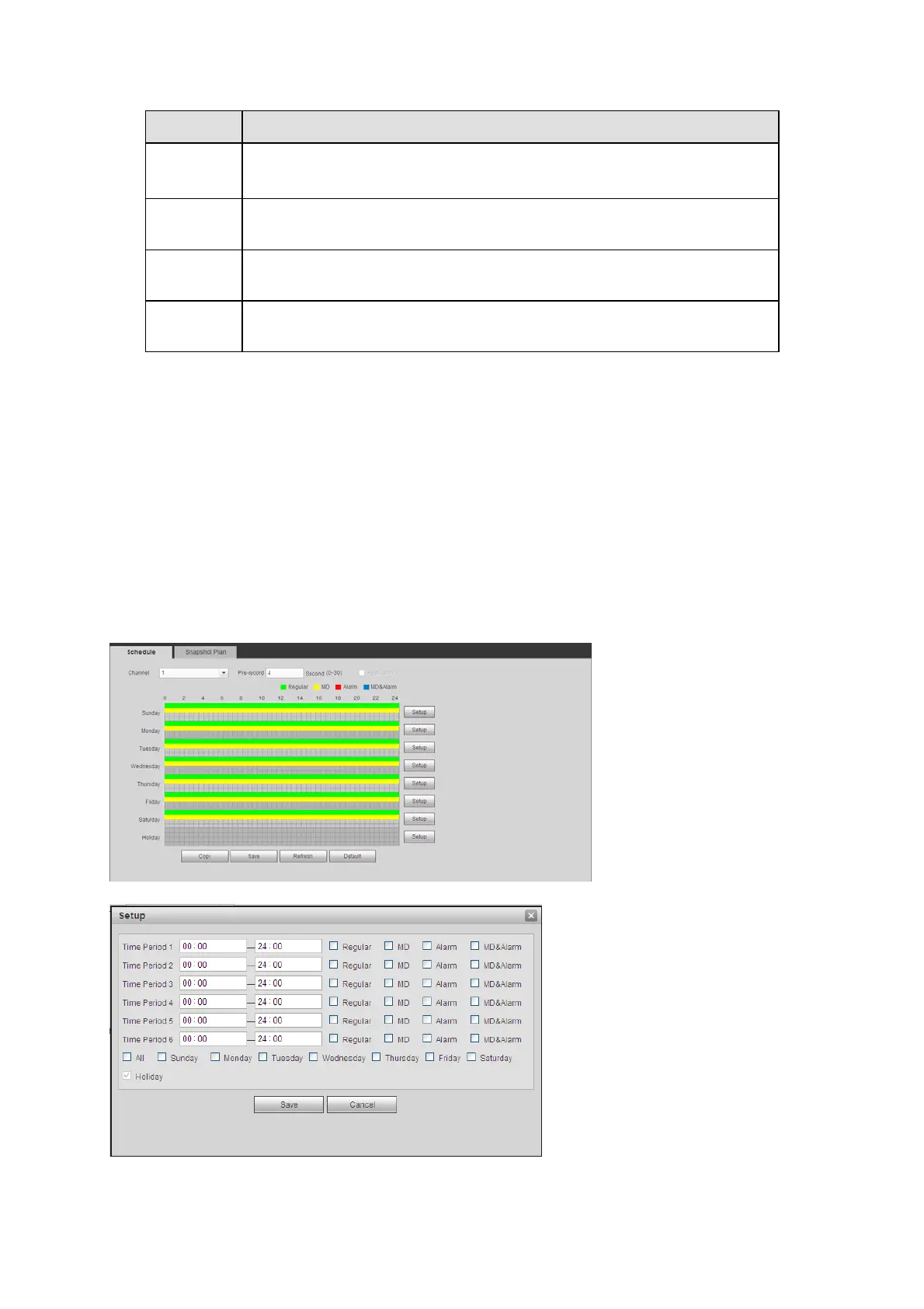 There are three record modes: general (auto), motion detect and alarm. There are six periods in
