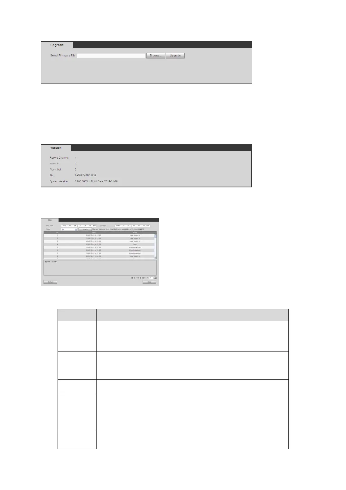 Here you can view record channel, alarm input/output information, software version, release date