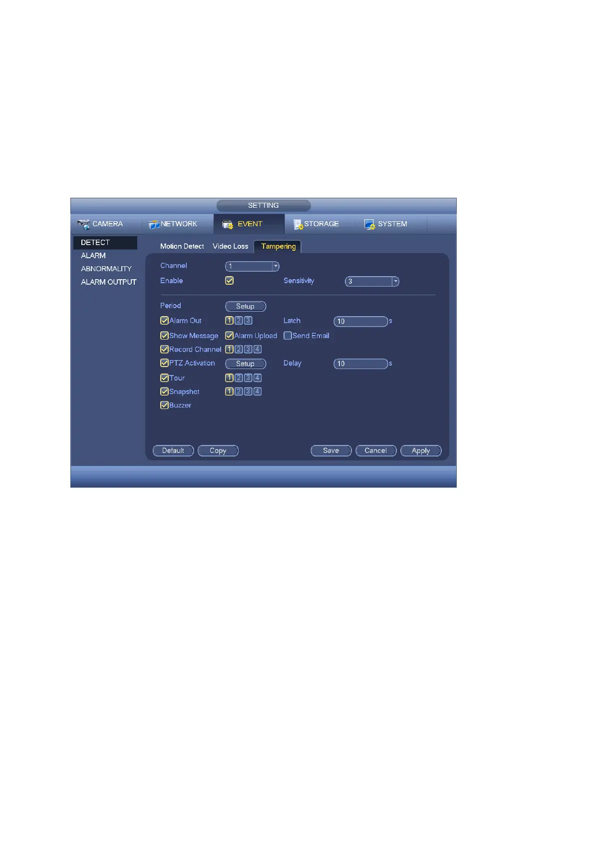 can not copy a channel setup in video loss mode to tampering mode.
