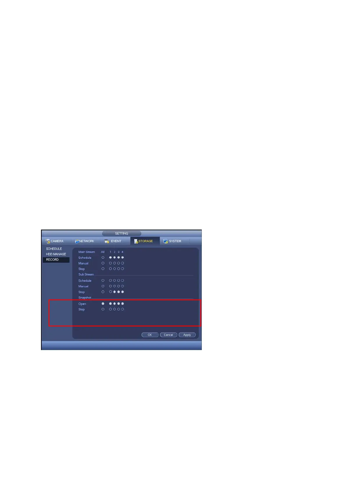 menu, from Setting->Storage->Record, check the box to enable snapshot function of