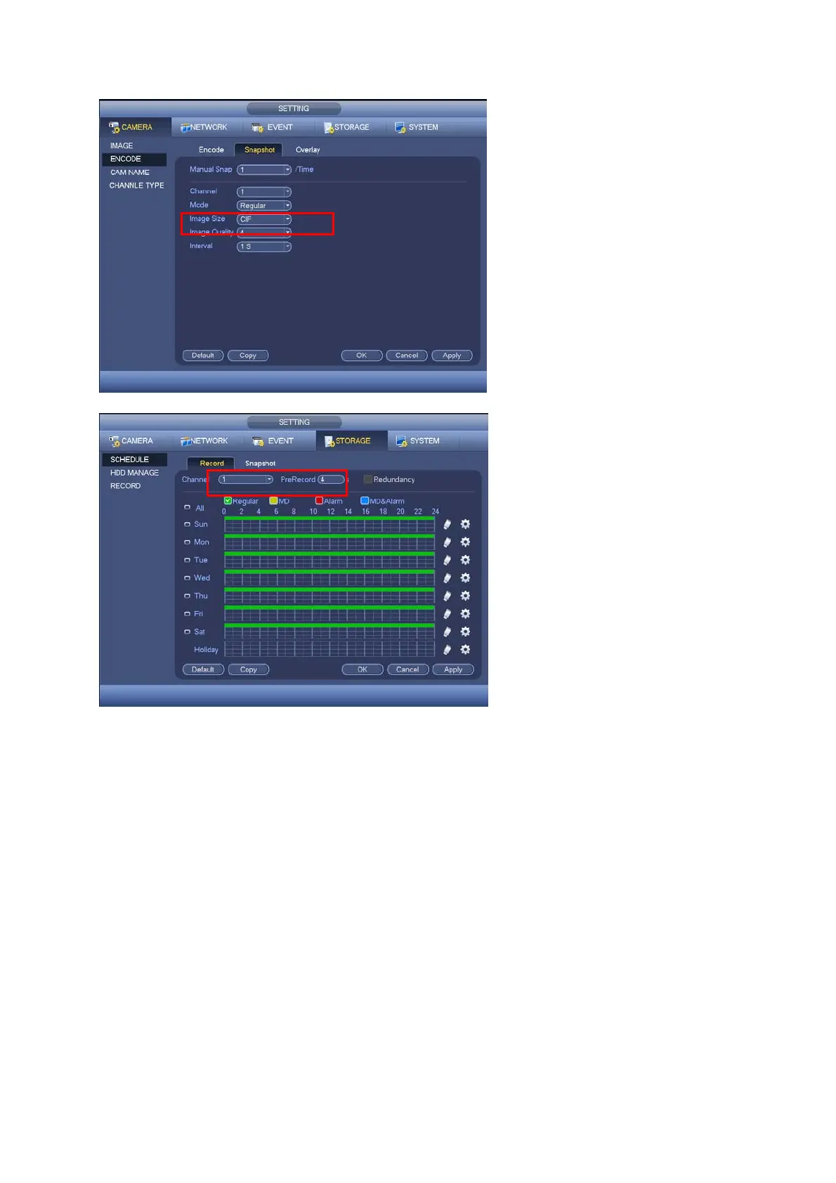 In main menu, from Setting->Event->Detect, enable snapshot function for specified channels
