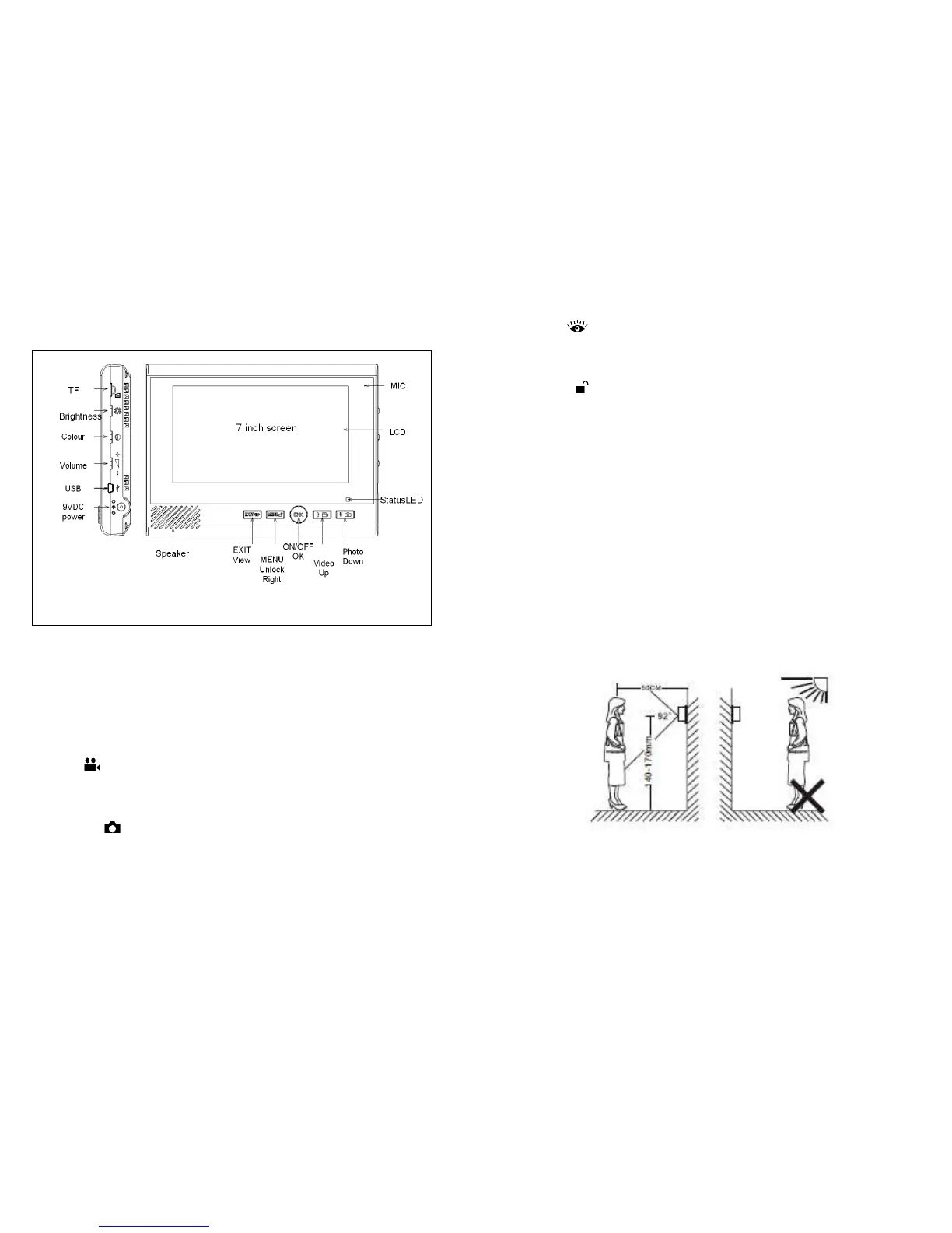 Outdoor unit shall be installed at 1.4 ~ 1.7 meter above the floor, and the camera
