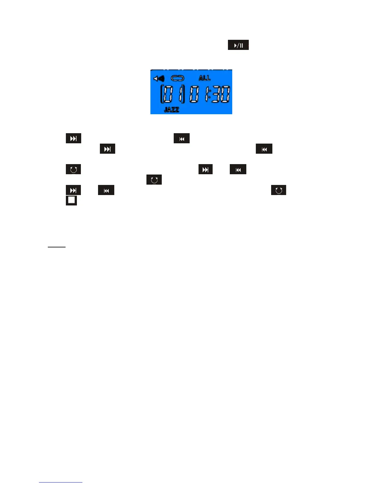 “repeat all” and “random”. Press to choose “repeat 1 song”, “repeat all” and “random”.