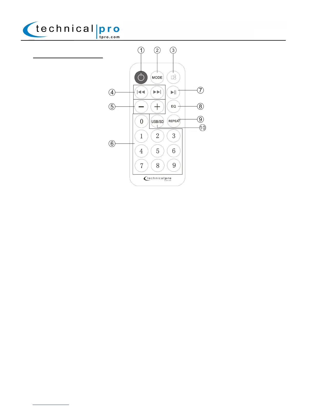 9. Repeat Control: Press this button to repeat the current track, all tracks on the USB flash drive, SD Card.