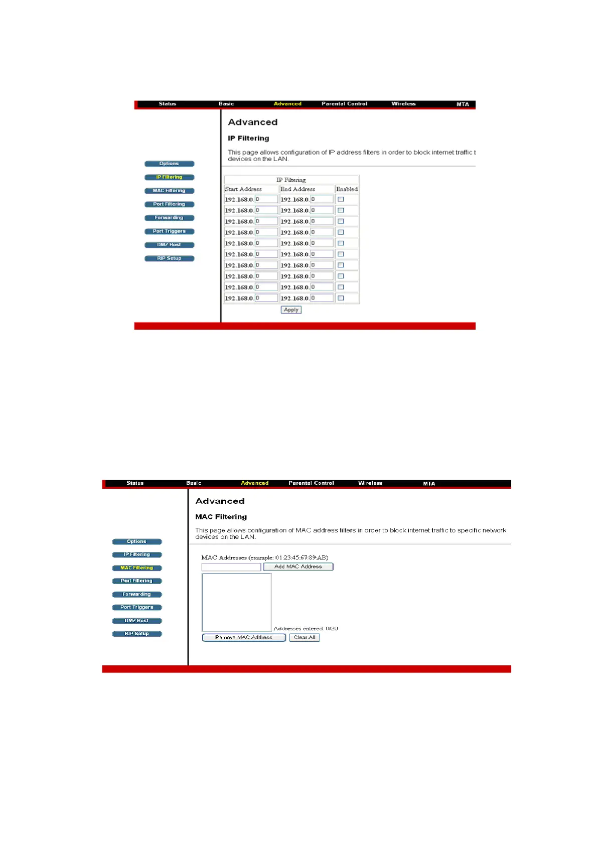 The MAC Filtering page enables you to enter the MAC address of specific