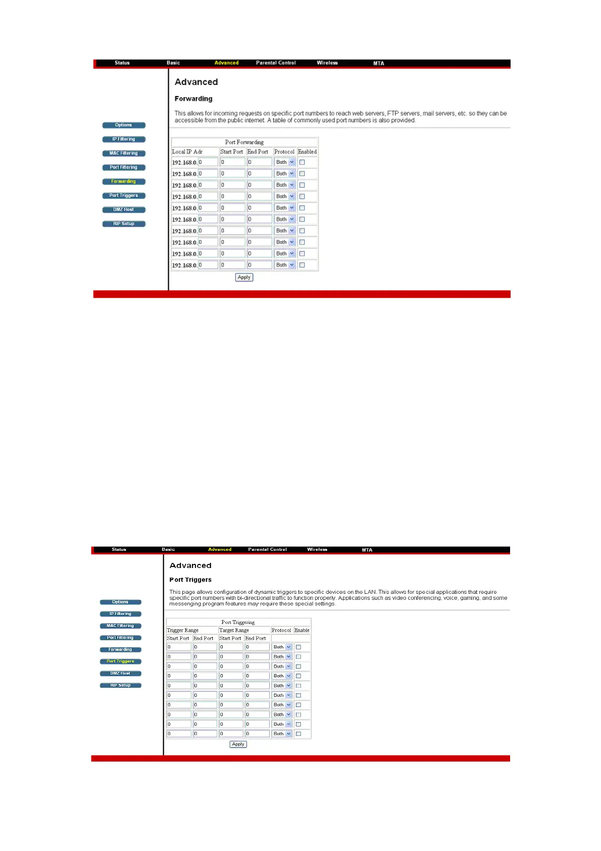 The Port Triggers page allows you to configure dynamic triggers to specific