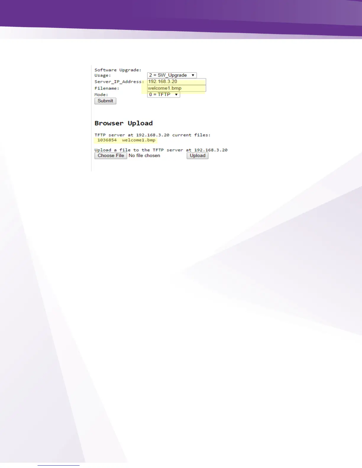 Figure 55 Upload Welcome Screen Files to internal TFTP