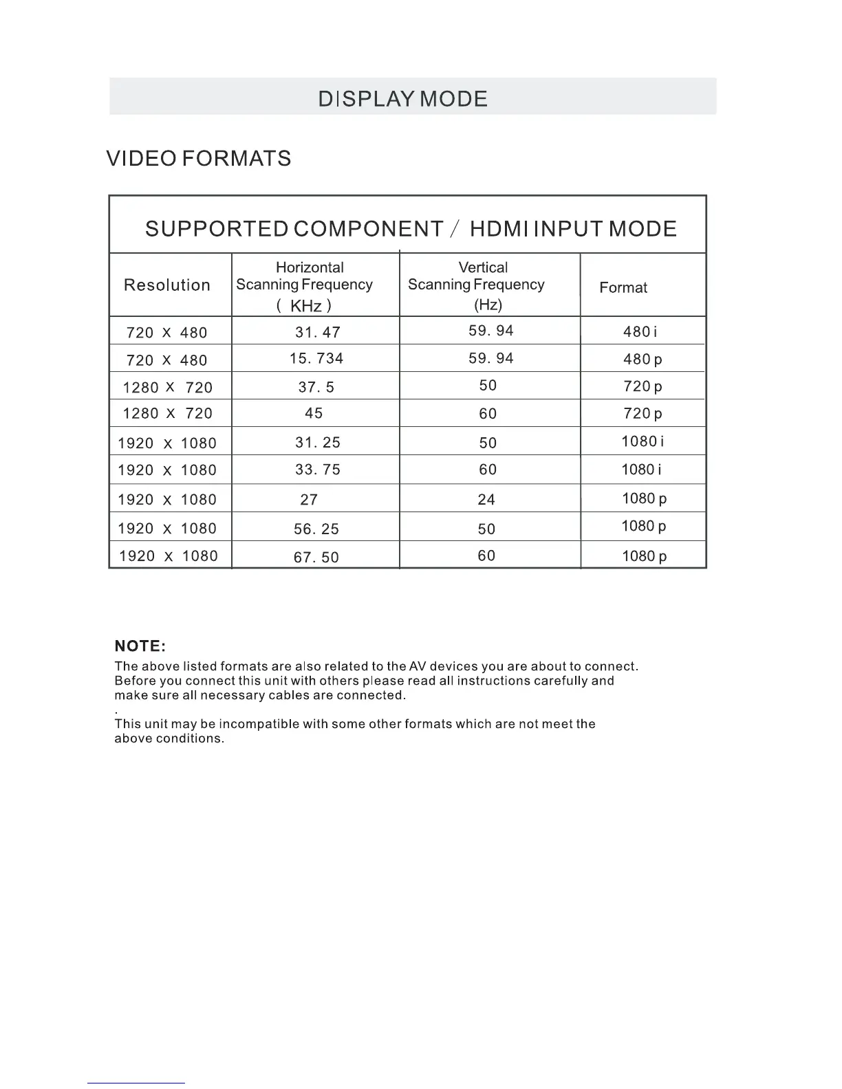 Technicolor TC2450A - Supported Video Input Formats