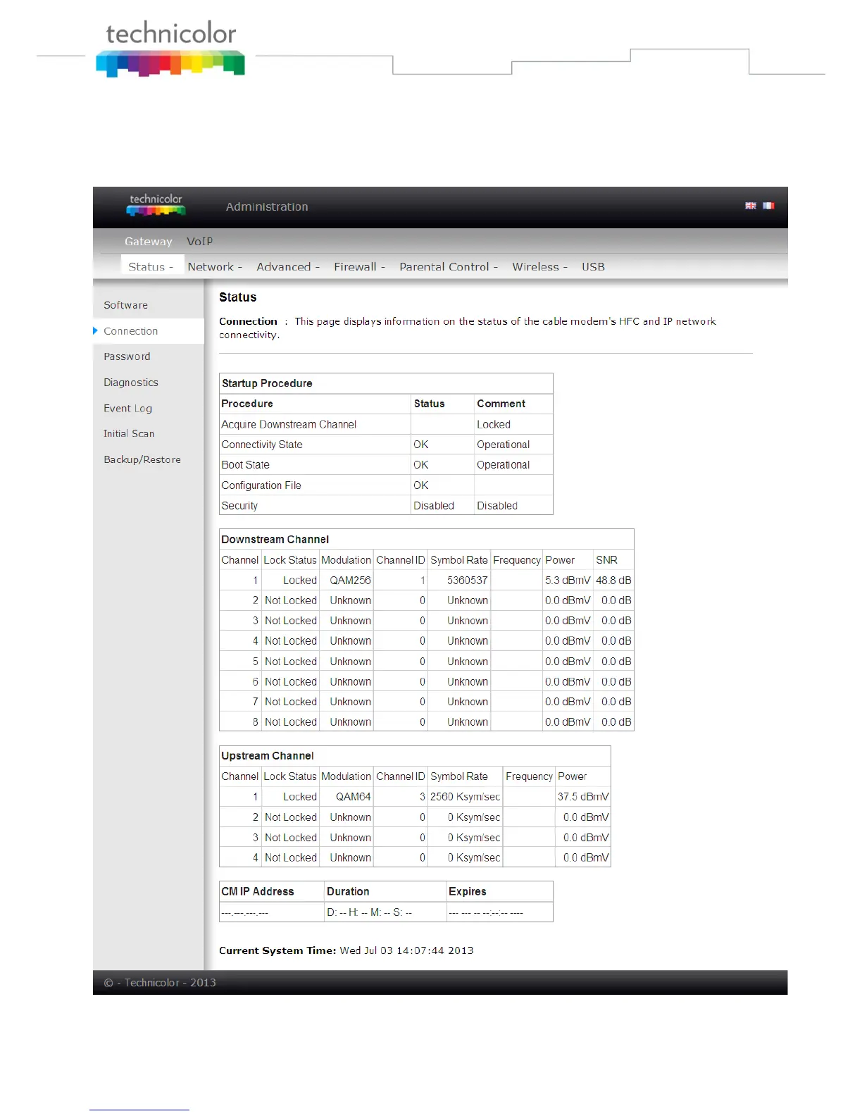 This page reports current connection status containing startup procedures, downstream and upstream status,