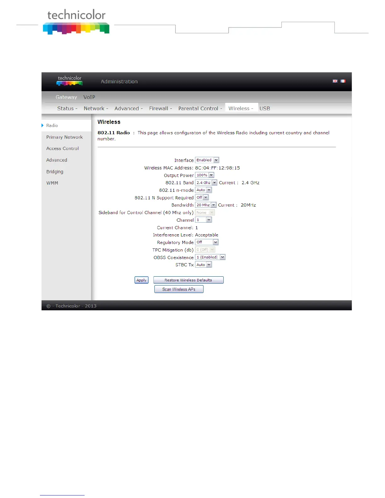 To set the basic configuration for the wireless features, click RADIO from the Wireless menu. These must