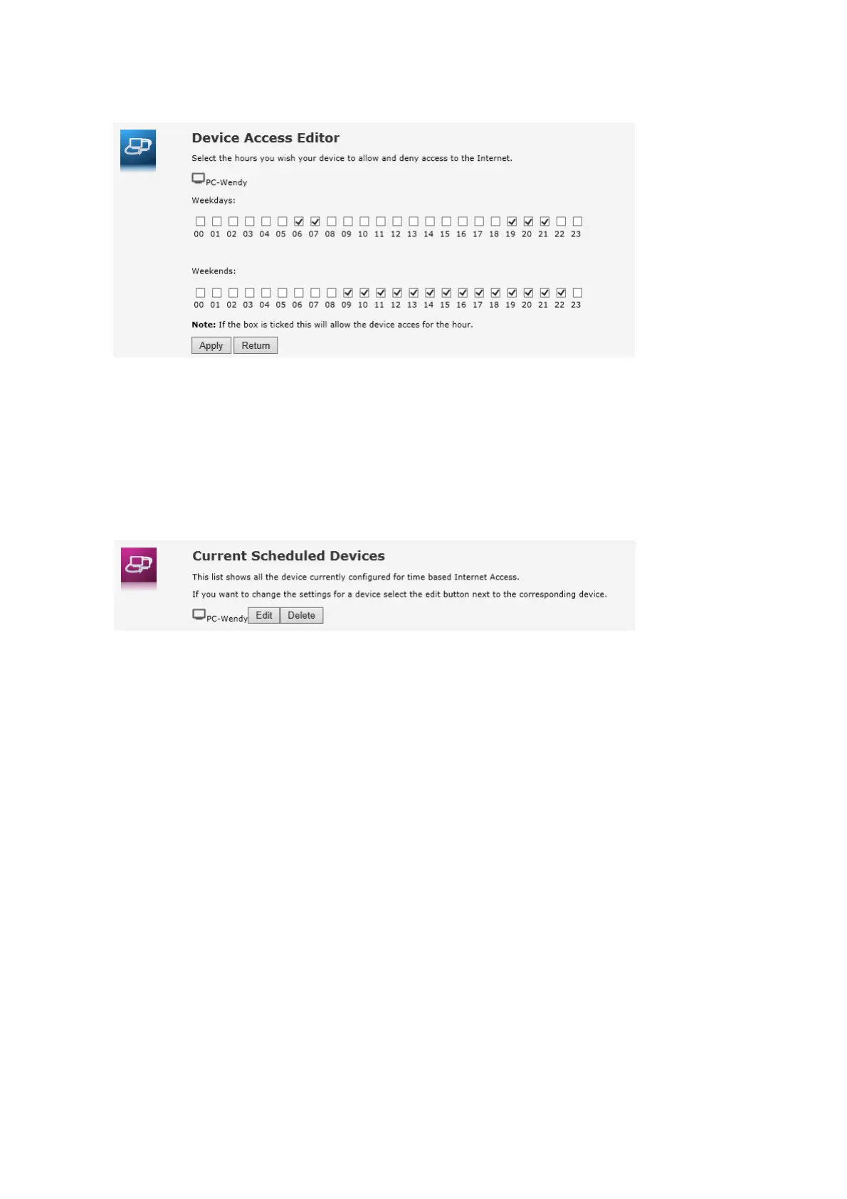 5 The Device Access Editor page appears. Select the hours for which you want to allow Internet access. For example, if