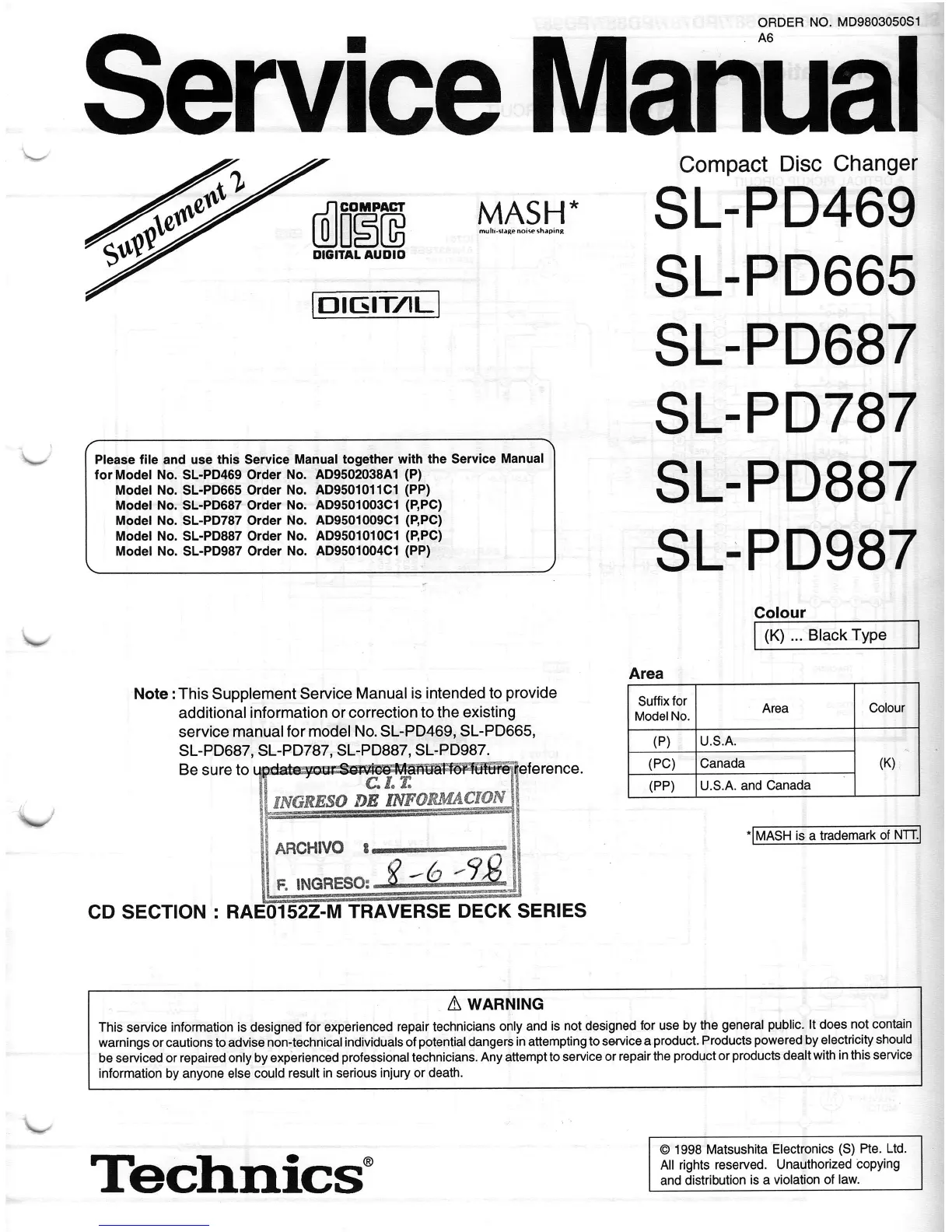 Model No. SL-PD987 Order No.