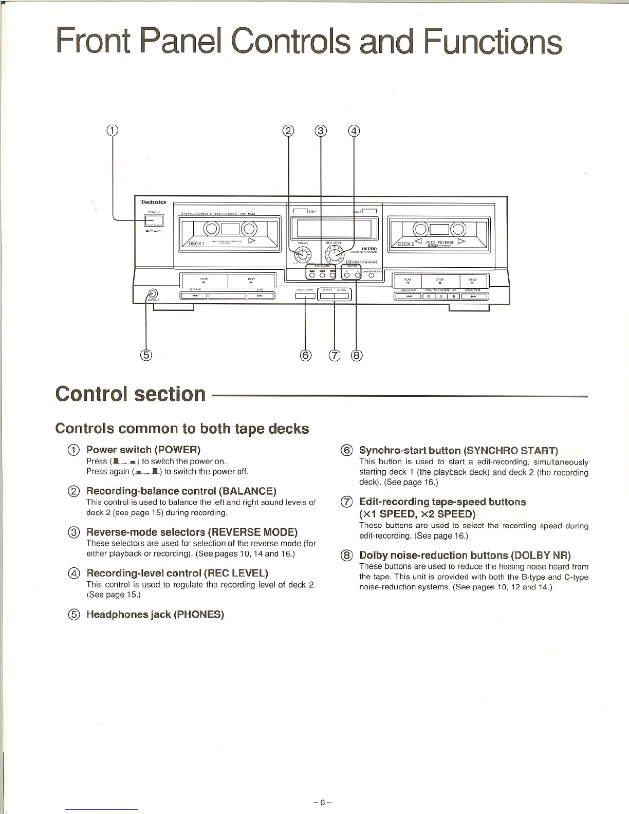 Technics RS-T9032 - Front Panel Controls and Functions; Control Section; Deck Controls