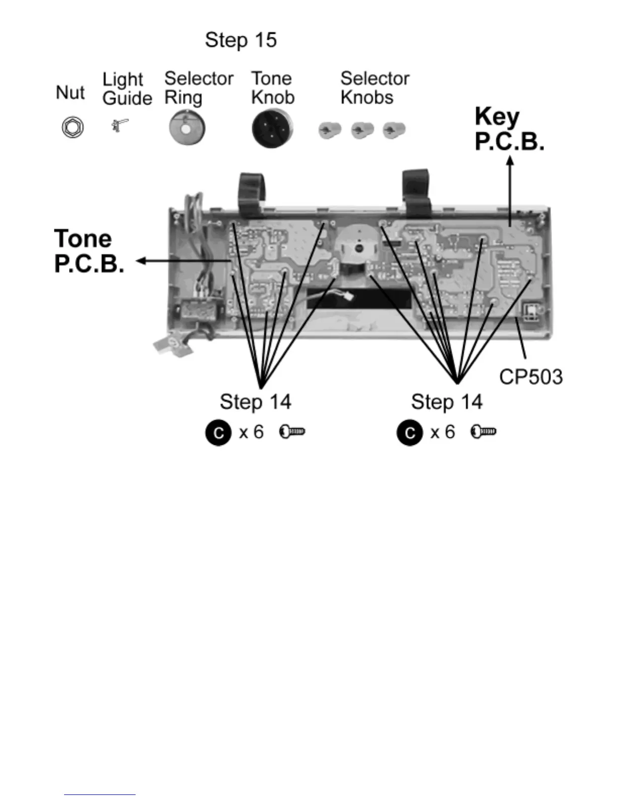 Step 15 Remove Selector Knobs, Tone Knob, Selector Ring, Light Guide and unscrew the nut./Take note