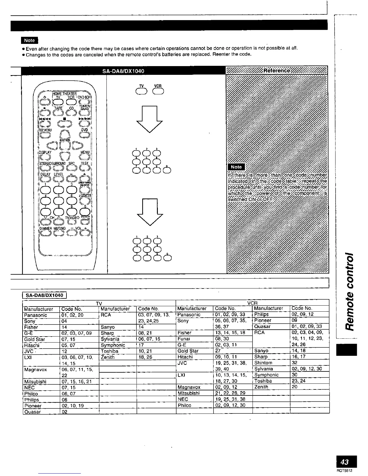Technics SA-DA8 - Remote Control Code Setting Reference