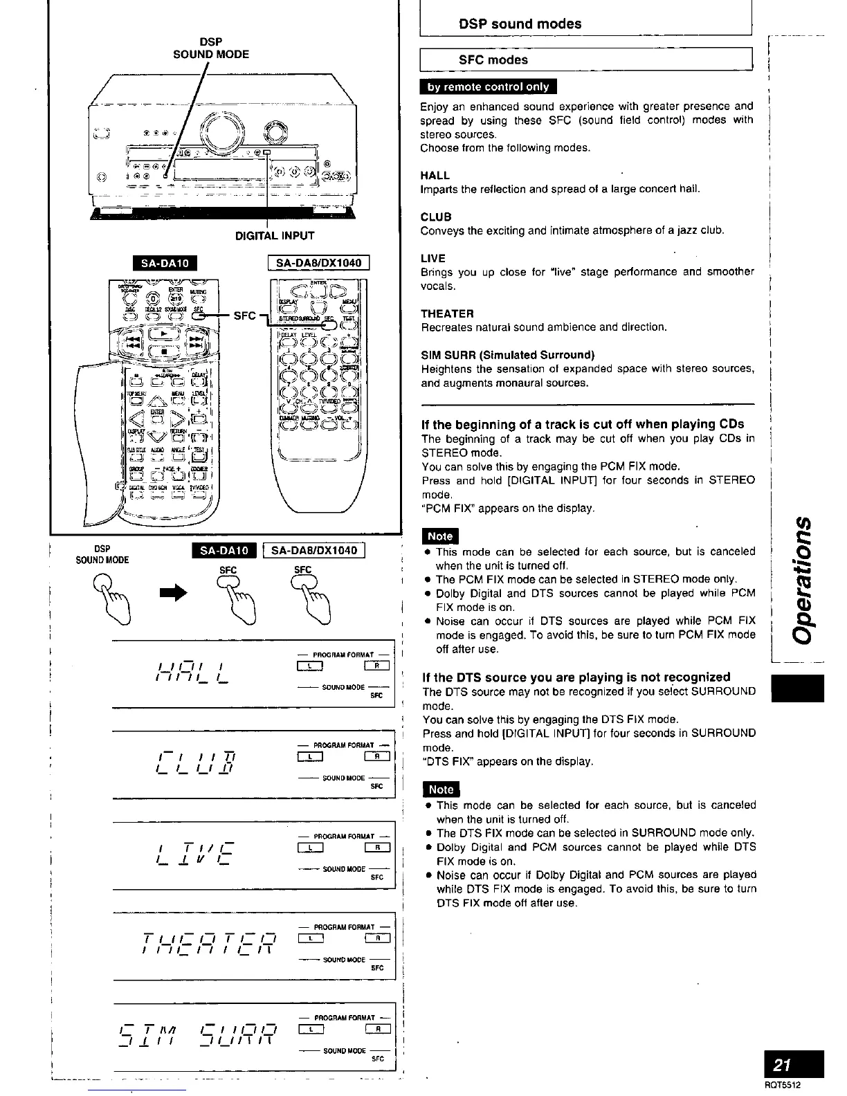 Technics SA-DX1040 - DSP Sound Modes: SFC and Fix Modes; SFC Mode Options; CD Playback Issue Resolution; DTS Source Recognition Fix