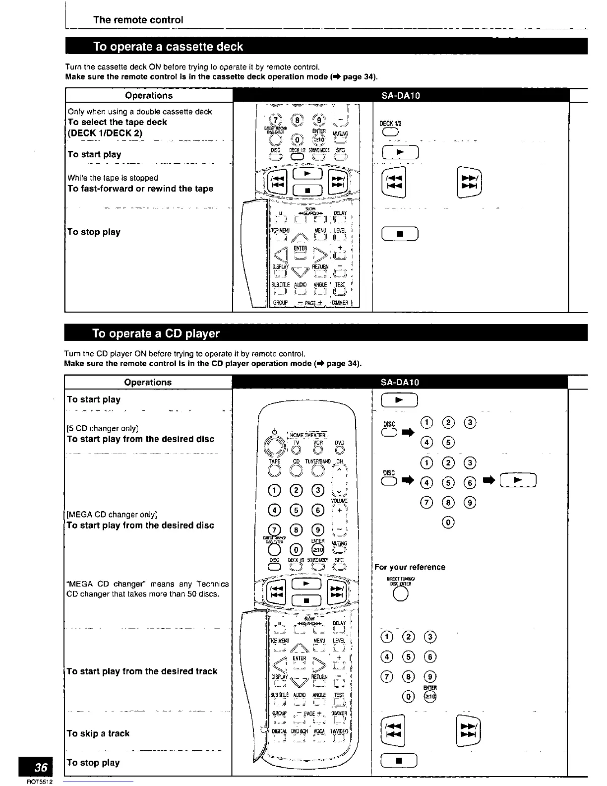 Technics SA-DX1040 - Remote Control: Deck & Player Operations; Operating Cassette Decks; Operating CD Players