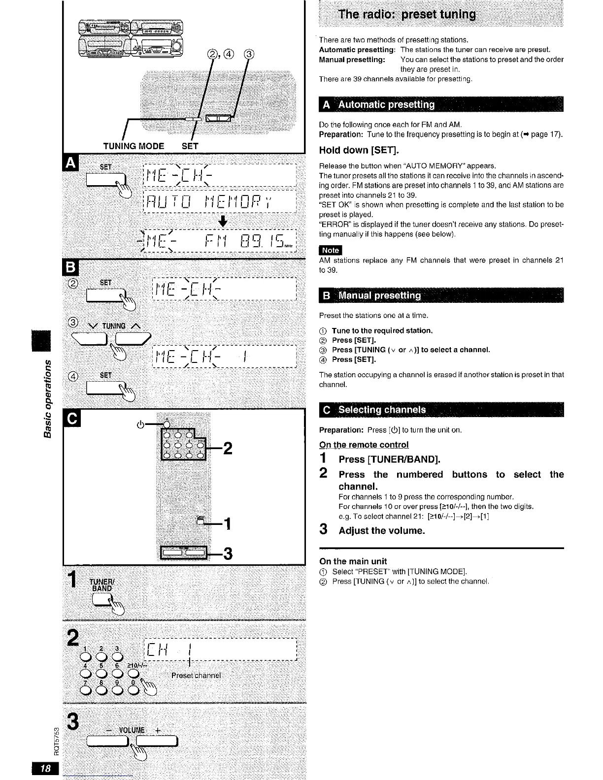 Technics SC-EH570 - Listening to the Radio: Preset Tuning; Automatic Presetting of Radio Stations; Manual Presetting of Radio Stations; Selecting Preset Radio Channels
