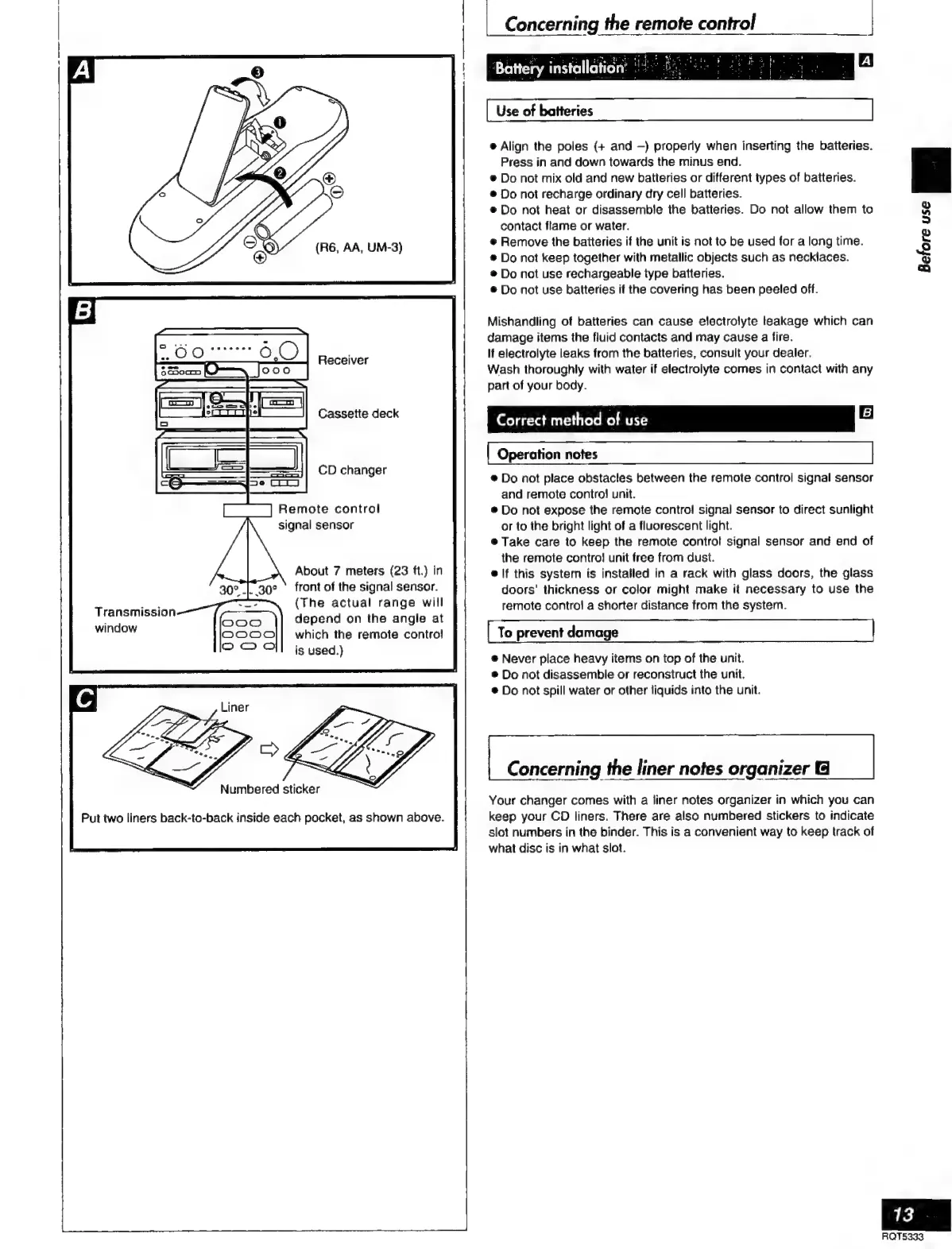 Technics SC-S2350 - Concerning the Remote Control Ooo; Correct Method of Use; Concerning the Liner Notes Organizer