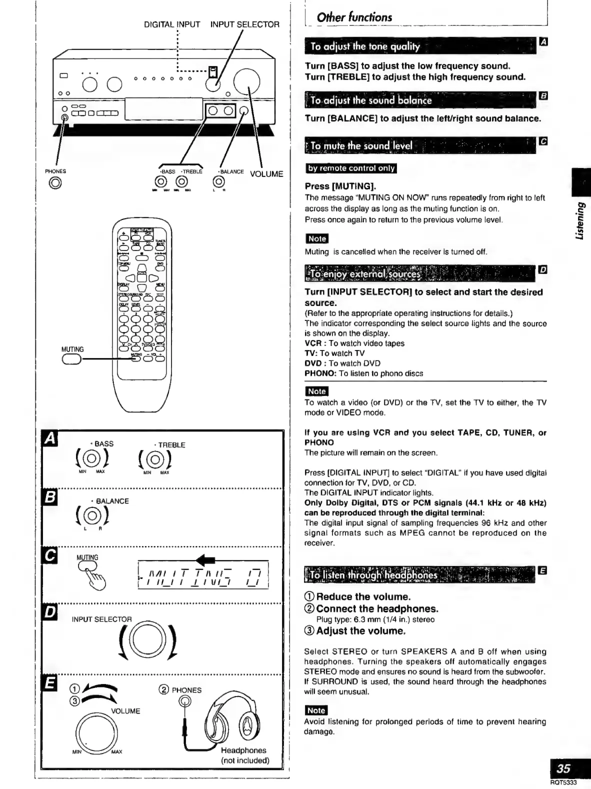 Technics SC-S2350 - Other Functions; To Adjust the Tone Quality; To Listen through Headphones
