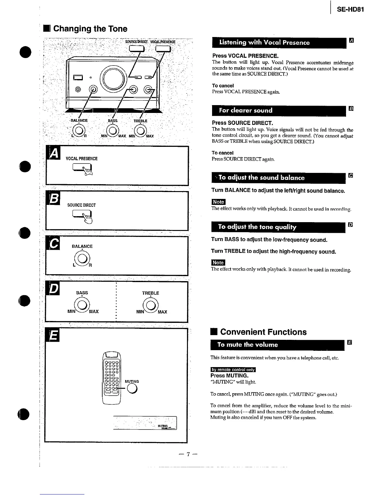 Technics SE-HD81 - Tone and Function Controls; Changing the Tone; Convenient Functions
