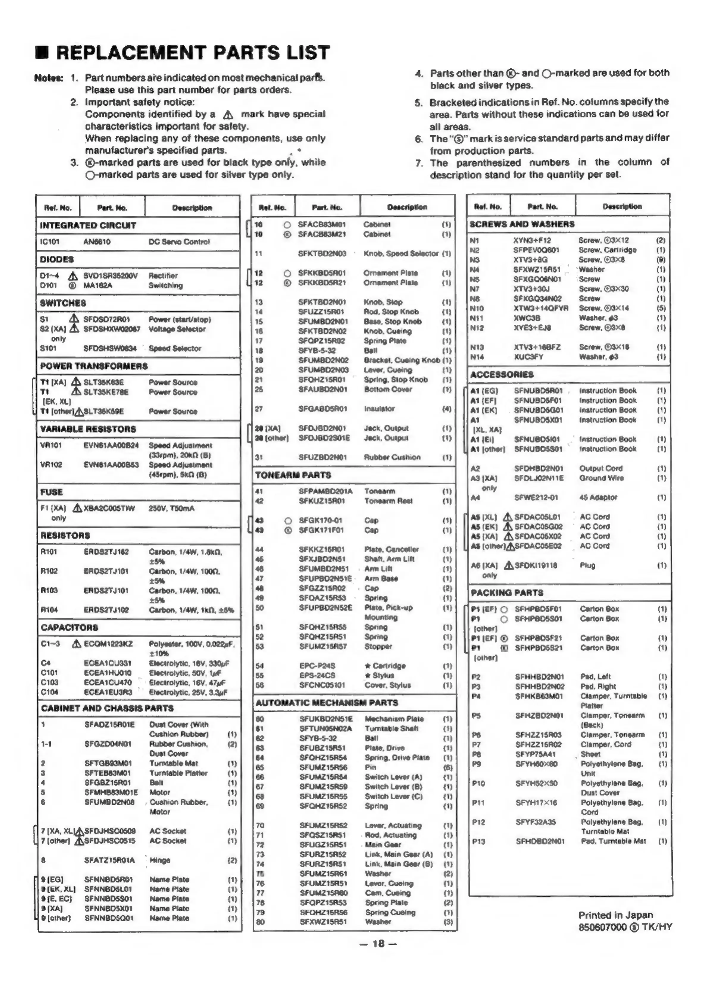 Technics SL-BD21 - Replacement Parts List