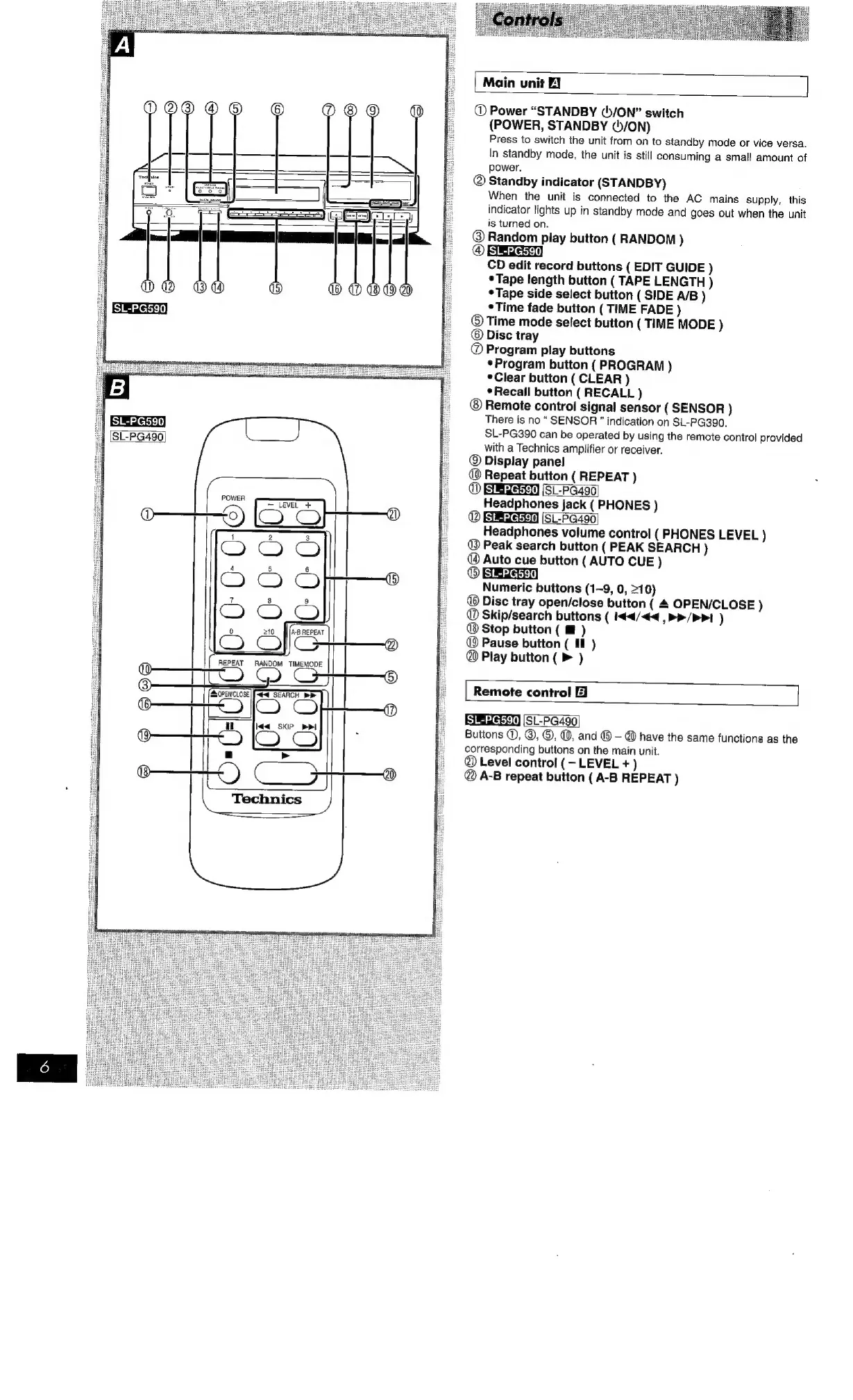 Technics SL-PG590 - Controls and Displays; Main Unit Controls; Remote Control Functions