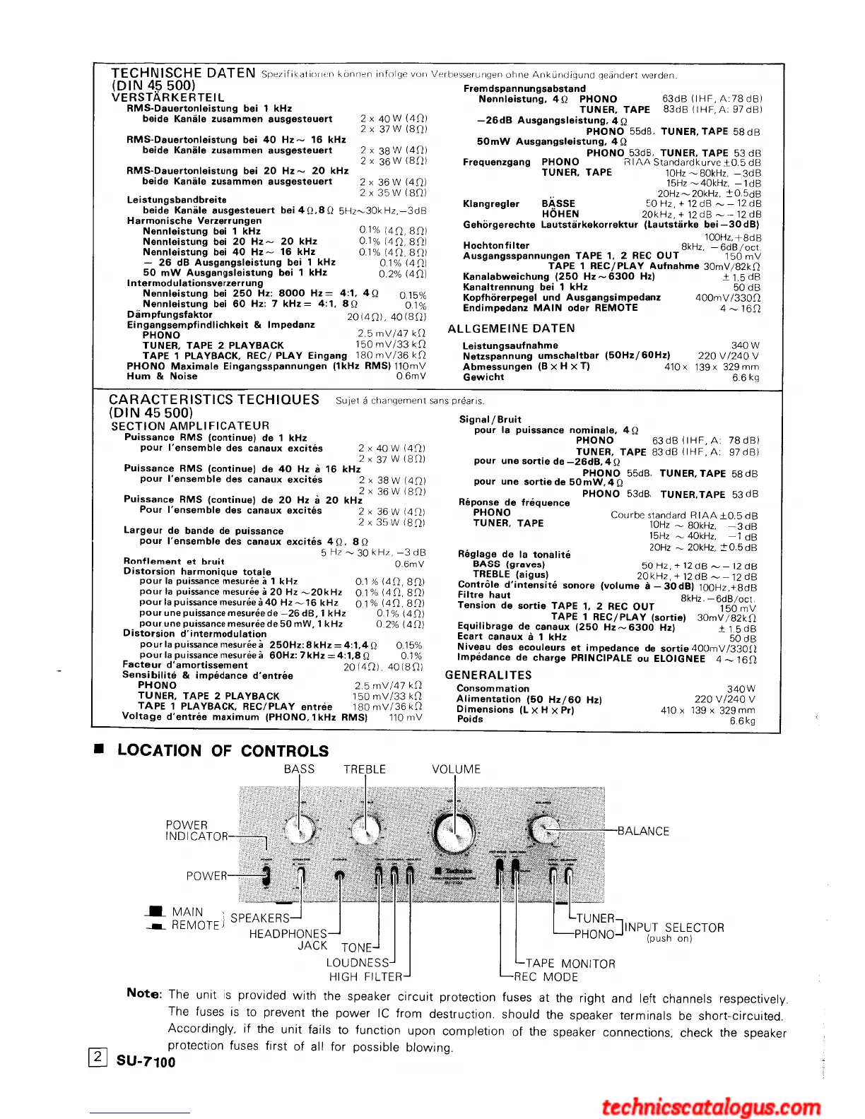 Technics SU-7100 (XSW) - Location of Controls