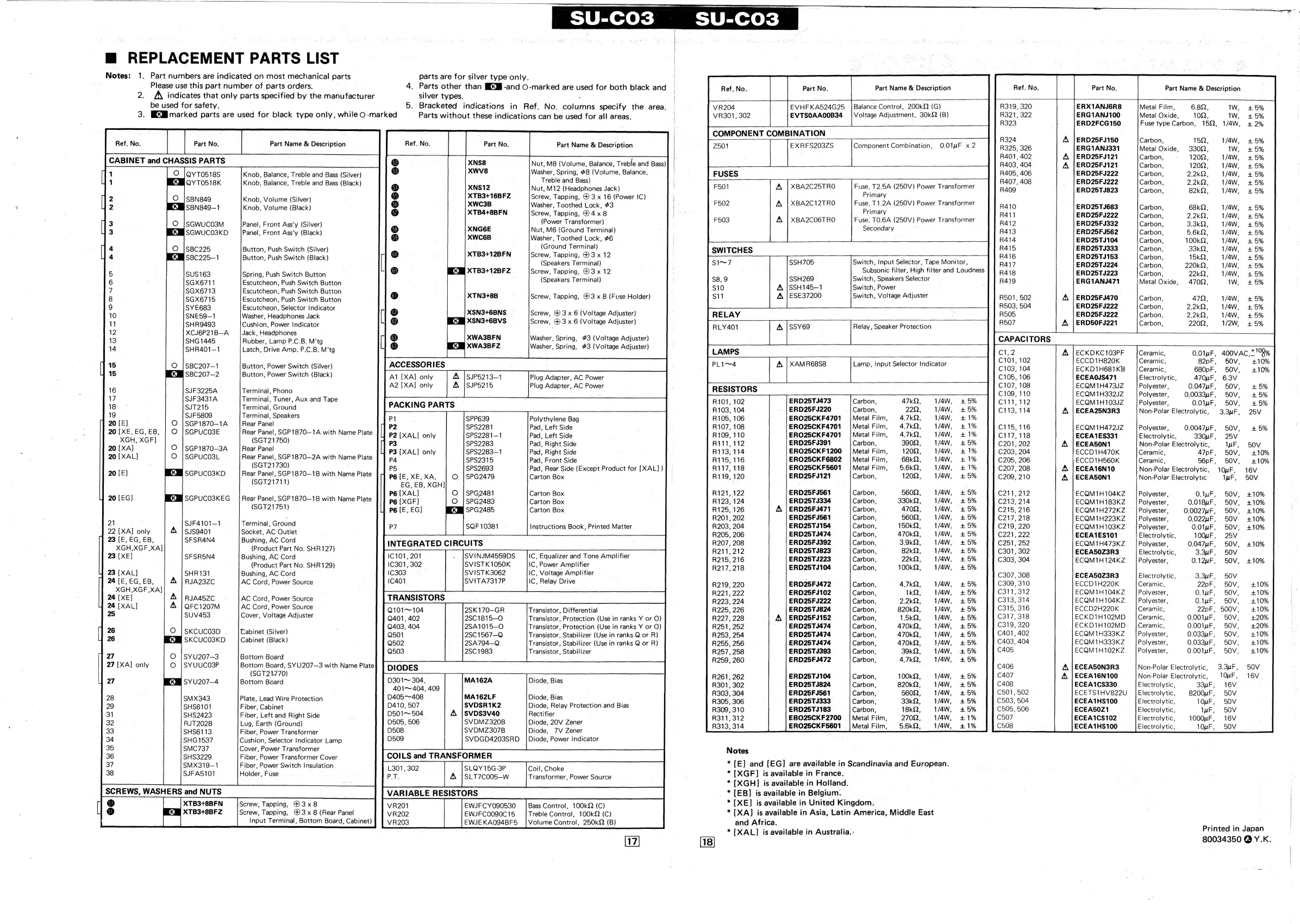Technics SU-C03 - Replacement Parts List; Integrated Circuits; Variable Resistors