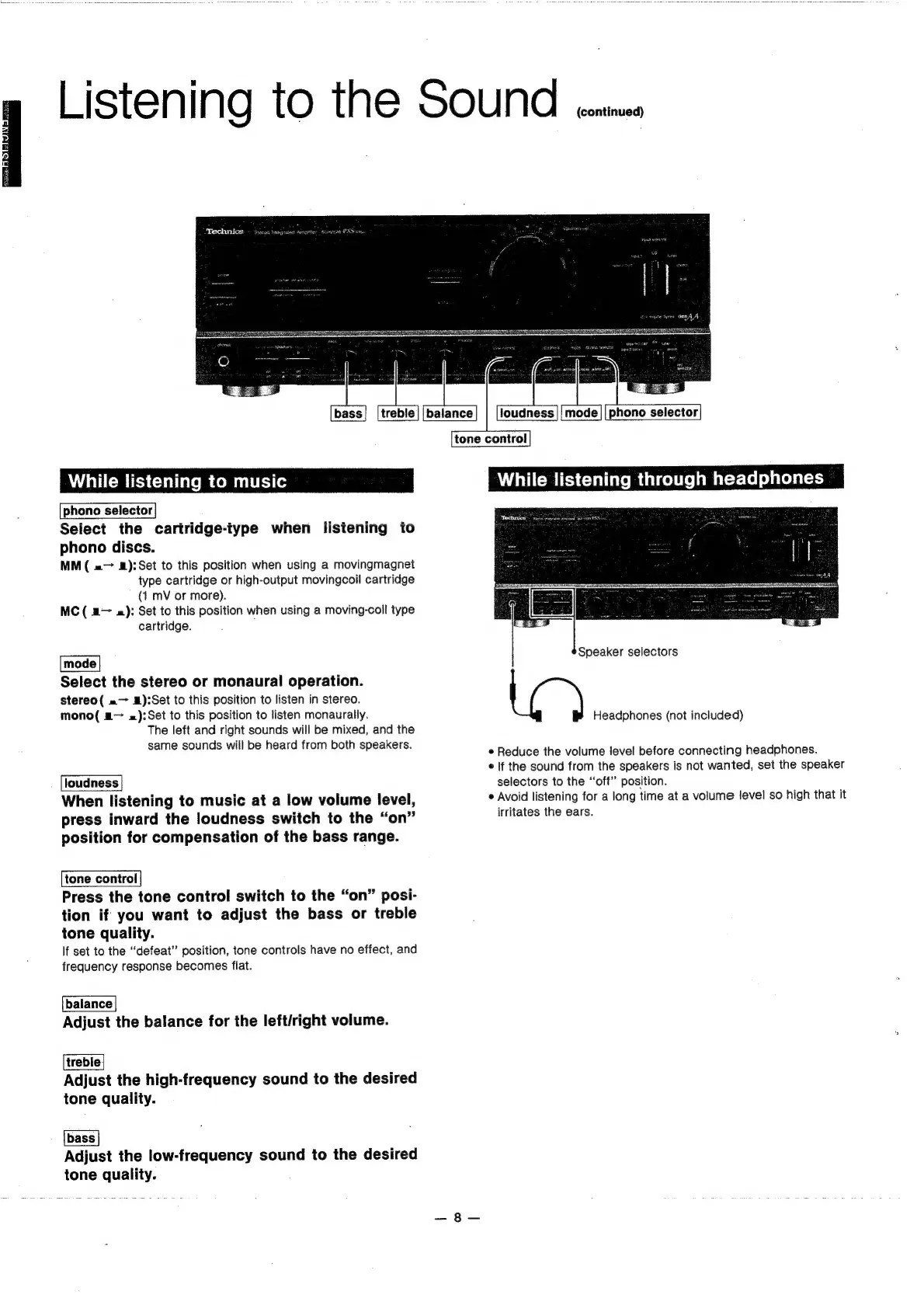 Technics SU-V570 - Phono Cartridge Selector Guide; Adjusting Tone, Balance, and Loudness; Listening Through Headphones