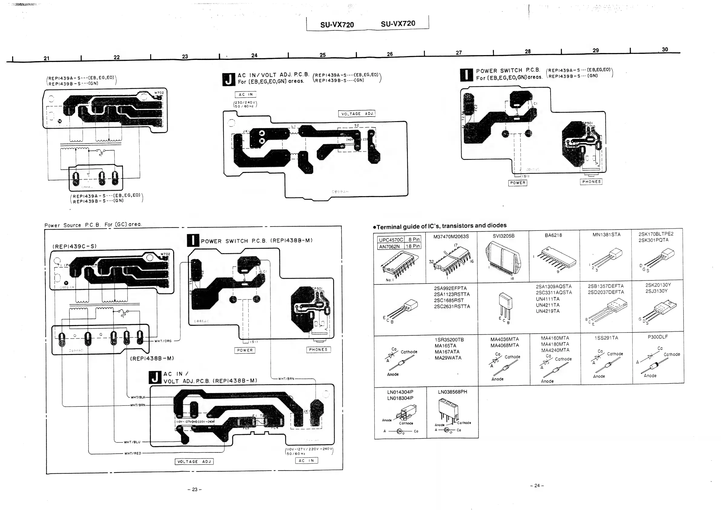 Technics SU-VX720 - Printed Circuit Board Layouts - Power and Control; Power Source, AC;Volt Adj., and Power Switch PCB Layouts; Component Terminal Guide