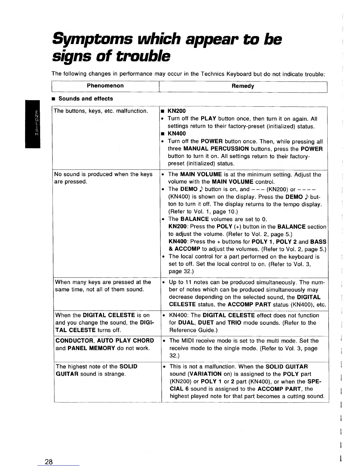 Technics SX-KN440 - Symptoms Which Appear to Be Signs of Trouble; Sounds and Effects Troubleshooting