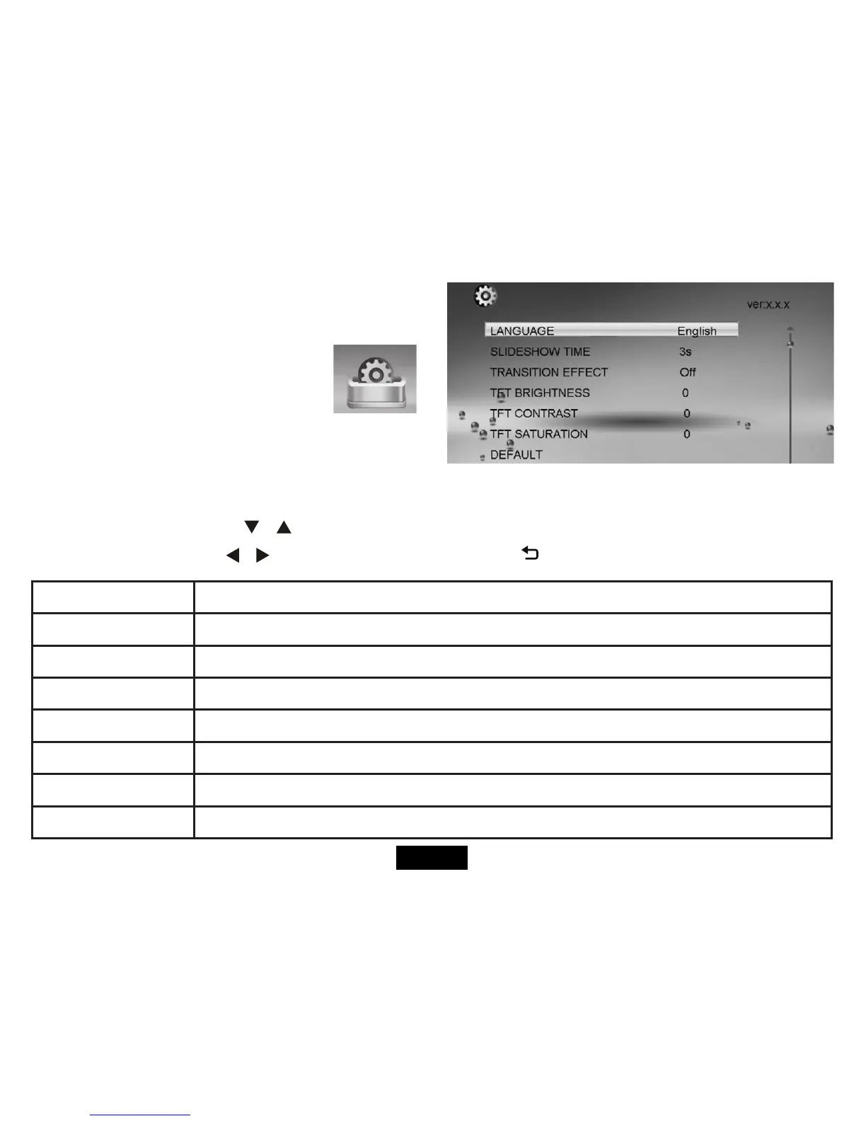 DEFAULT Restore the frame to the settings it had when it left the factory. All user settings will be reset.