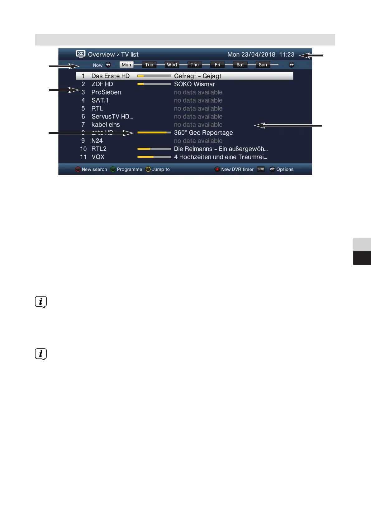 1. Viewing time > provides the time of the programmes being shown. Time line >