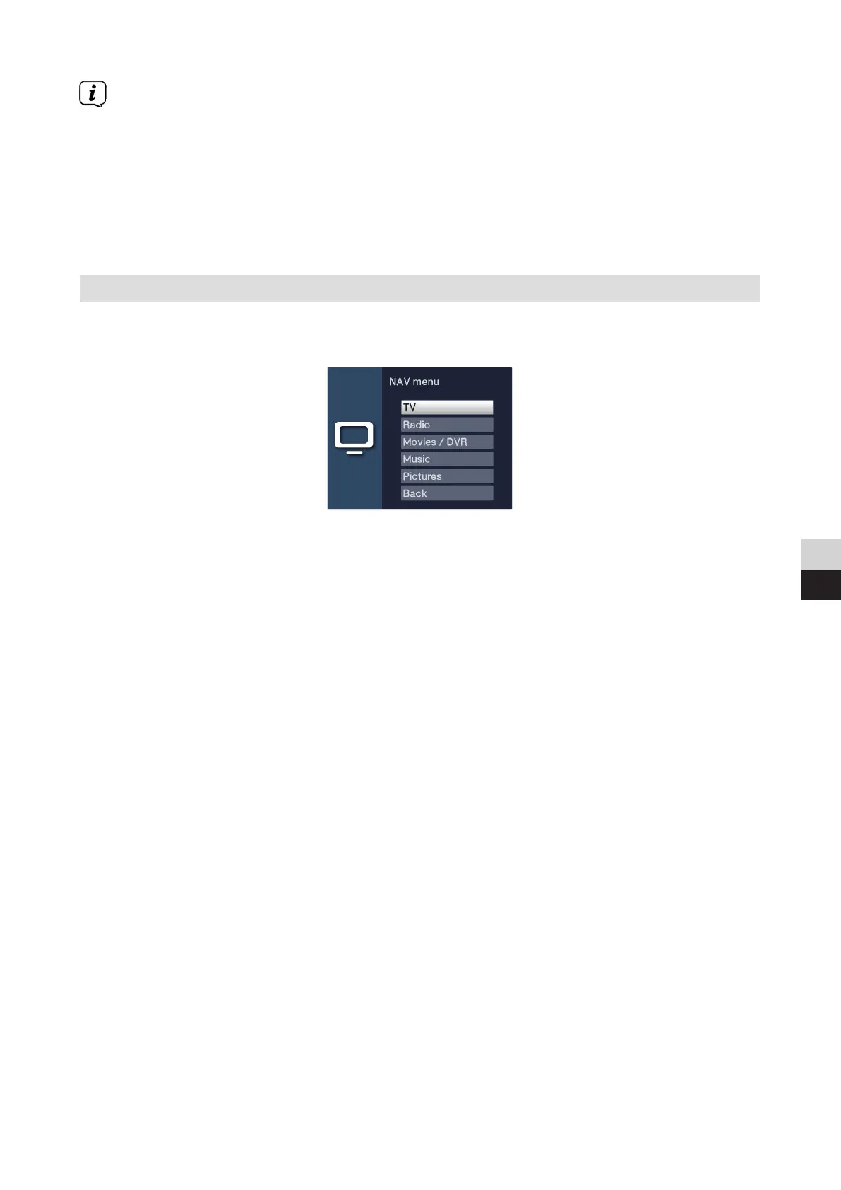 > You can open the Navigation menu (NAV Menu to select the desired function