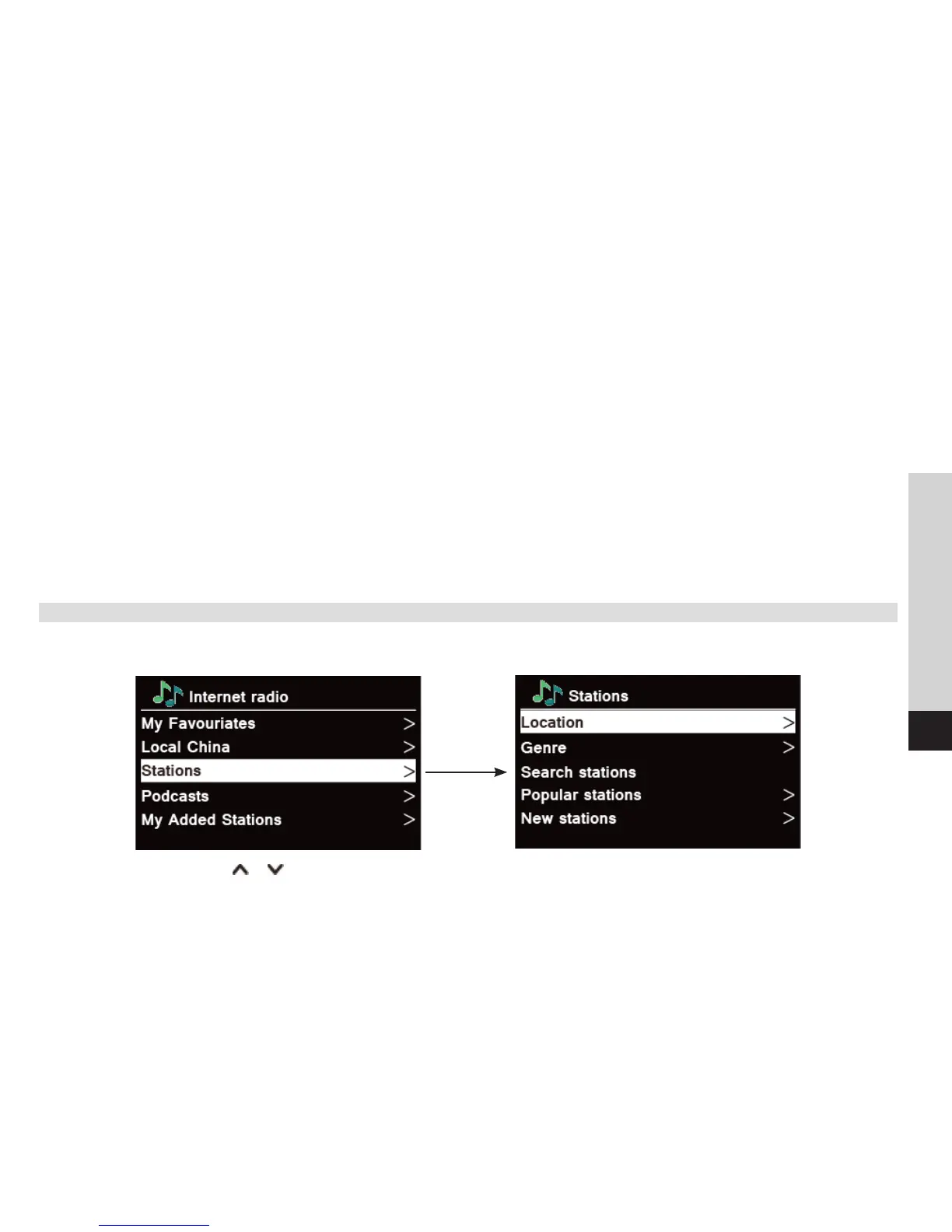 > Search stations (Vyhľadávať stanice) vám umožňuje vyhľadať konkrétnu stanicu zadaním celého názvu