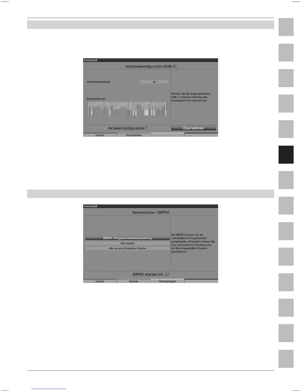 (Als de DVB-T bron gedeactiveerd werd, verschijnt direct “Kanalen zoeken / ISIPRO”)