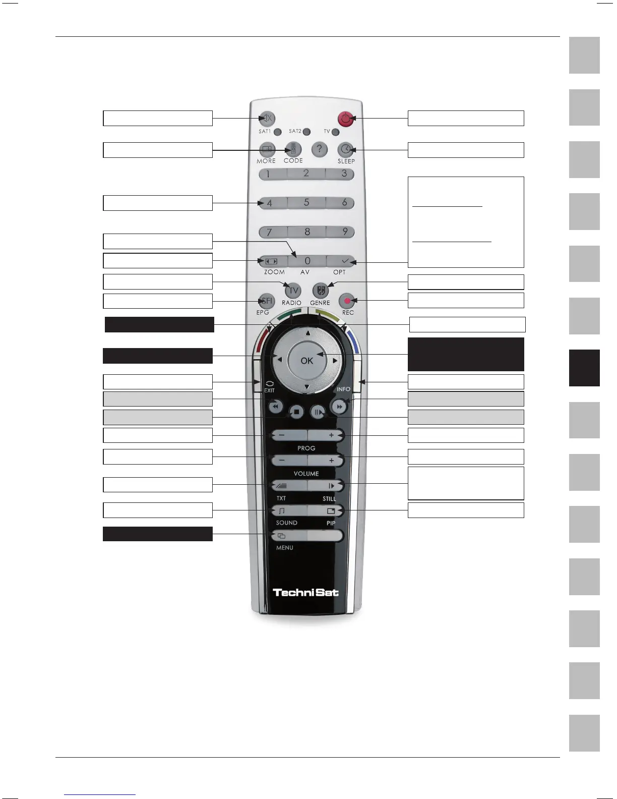 Denne fjernkontrollen kan betjene to TechniSat-mottakere og en TechniSat-TV med samme koding ved å svitsje mellom fjernkontrollvalgene.