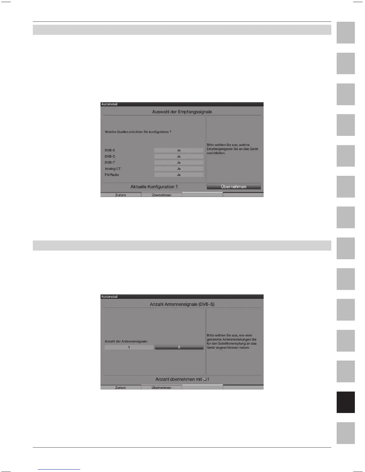 > A bal/jobb nyílgombokkal válassza ki, hogy egy vagy két antennajelet csatlakoztatott-e.