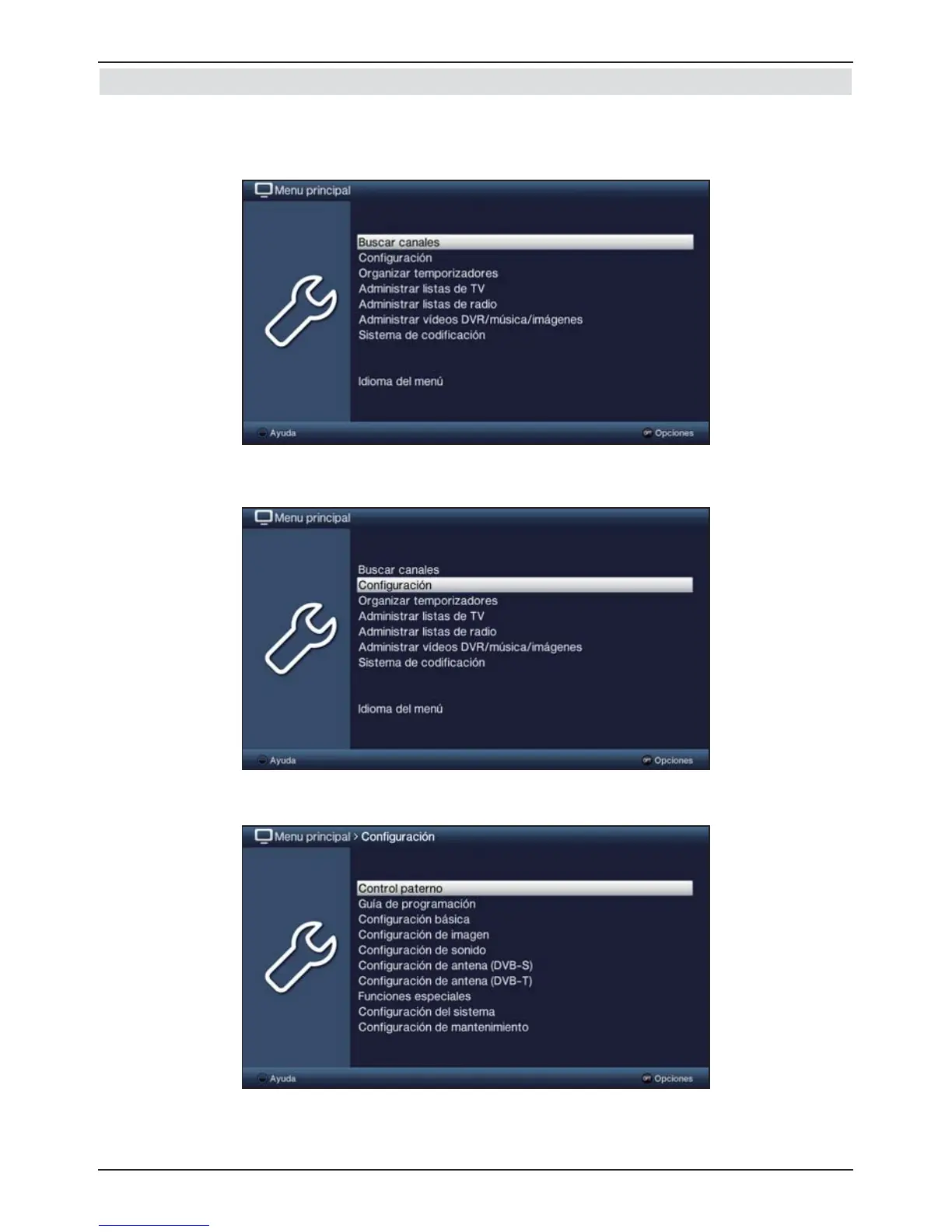 El siguiente ejemplo refleja la forma de acceder al menú principal y de abrir un submenú.