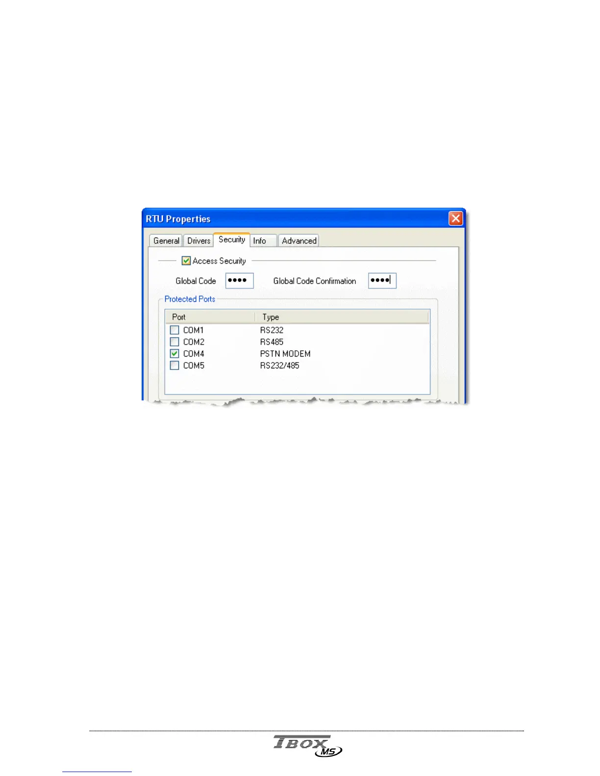 From the RTU properties tab ‘Security’, you activate the general access security