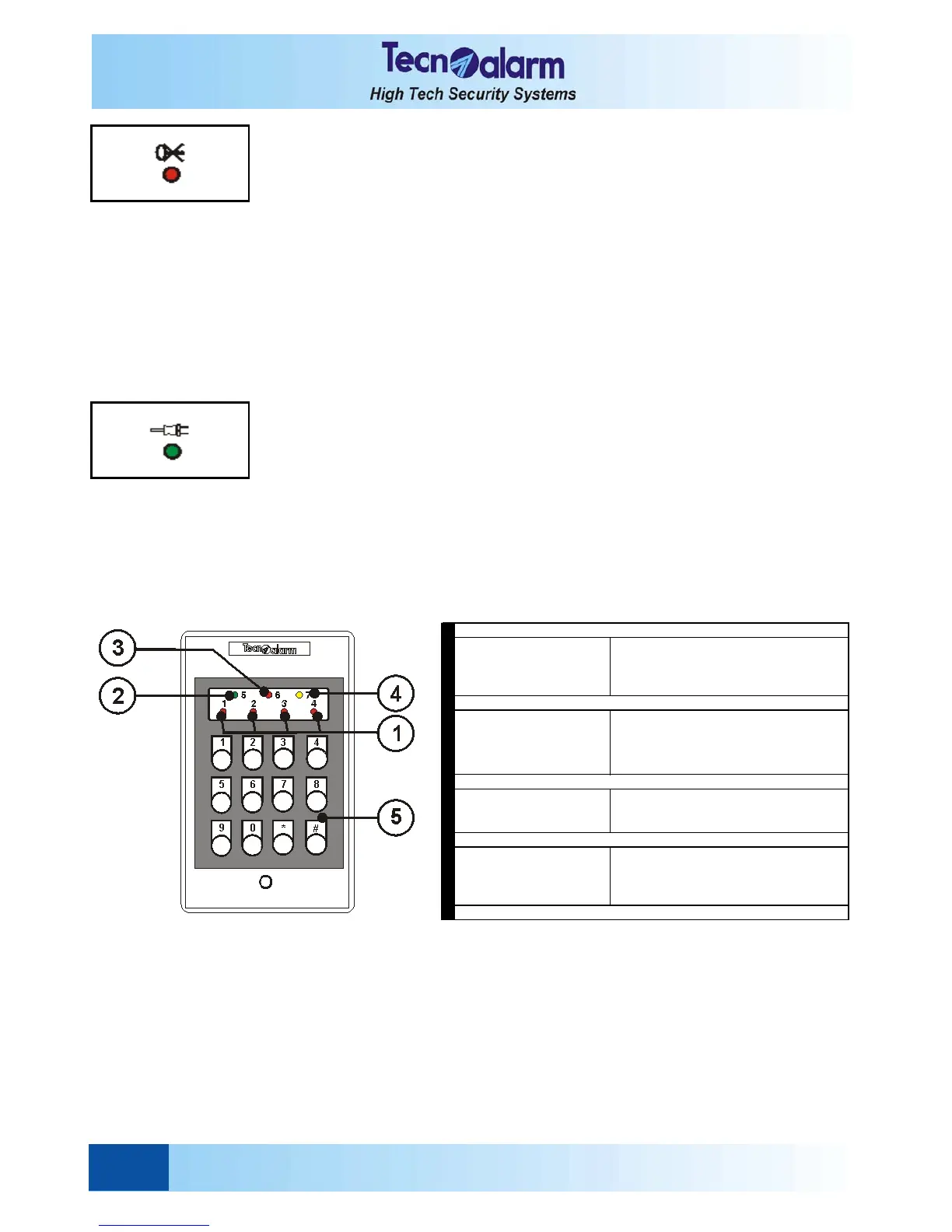 The electronic keypad permits program status signaling through a series of coloured leds. It does not provide signaling